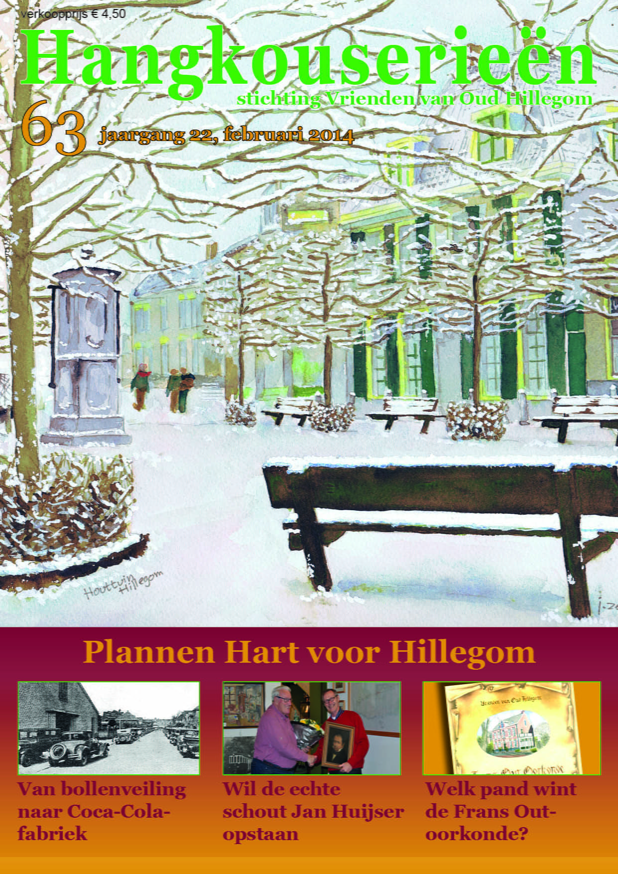 In bestuurlijke zin zijn voor de SVvOH op dit moment vooral de plannen van de gemeente tot herinrichting van het centrum actueel. Wat de Vrienden ervan vinden is in Hangkouserieën te lezen – evenals historische artikelen, onder andere over de Coca-Colafabriek in de Hillegomse bloembollenveiling. Ook worden de 10 panden gepresenteerd die genomineerd zijn voor de Frans Out oorkonde, die dit jaar tijdens de Vriendenavond op 14 maart uitgereikt wordt. De Stichting reikt de oorkonde jaarlijks uit aan eigenaren van panden die ervoor gezorgd hebben dat die panden op een historisch verantwoorde wijze in stand gehouden of gerestaureerd zijn.