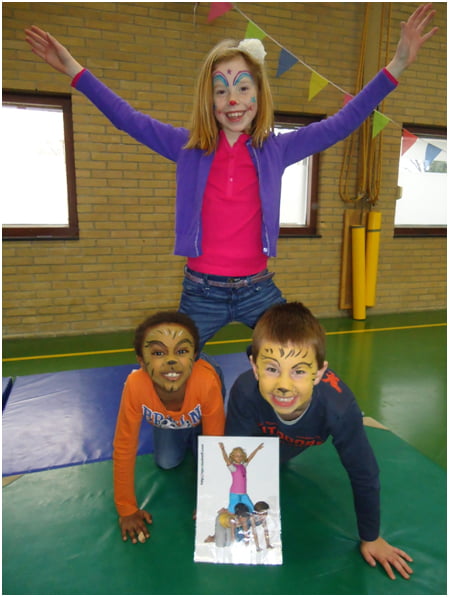 Op dinsdagmiddag werd er in de gymzaal circusles gegeven door gym meester René ter Metz. De kinderen hadden veel plezier en konden al snel allerlei acrobatische kunstjes. Doordat de kinderen mooi geschminkt waren leek het net een echt circus!
