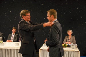 Hillegom – Op 2 december is tijdens de bijzondere raadsvergadering de heer Arie van Erk geïnstalleerd als burgemeester van onze gemeente. Tijdens de besloten raadsvergadering gaf waarnemend burgemeester Jan Broekhuis de voorzittershamer en de ambtsketen aan Van Erk.