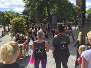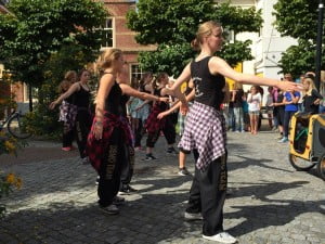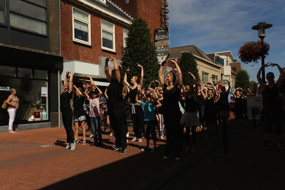 De dans startte met een zestigtal leerlingen van de balletschool aan het begin van de hoofdstraat en eindigde bij de pomp. Onderweg werden de nieuwe flyers uitgedeeld en kwamen er steeds meer dansende leerlingen bij.