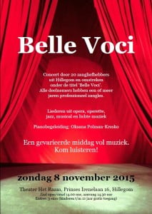 Hillegom – Op zondagmiddag 8 november a.s. kunt u weer genieten van liederen in uit opera en operette, jazzklassiekers, popsongs en stukken uit films en musicals. Dan geven 20 zangliefhebbers onder de naam ‘Belle Voci’ een concert in theater Het Raam in Hillegom.