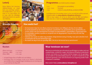 Hillegom/Streek – Op 2 en 3 juli kunnen tennisliefhebbers weer tennissen tijdens het Adamas Benefiet Tennistoernooi bij HTC Hillegom en LTC Lisse. De gehele opbrengst van beide benefiettoernooien komt ten goede aan het Adamas Inloophuis.