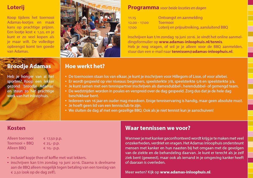 Inschrijven kan tot en met 20 juni voor het tennistoernooi en de barbecue via www.adamas-inloophuis.nl. Deelname zonder barbecue kost € 17,50- per persoon inclusief een kopje koffie of thee bij binnenkomst. Deelname inclusief barbecue kost € 25.00 per persoon. Mensen die alleen aan komen moedigen en wel mee willen barbecueën, betalen tot 20 juni € 10,00 per persoon, daarna € 12,50 per persoon.