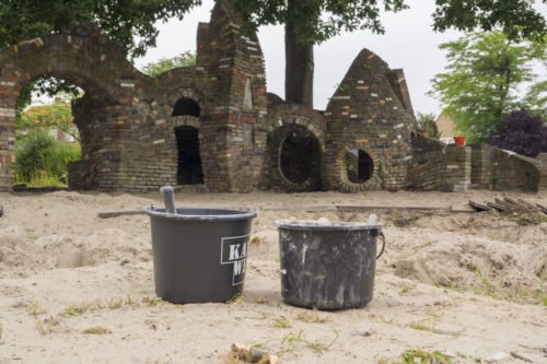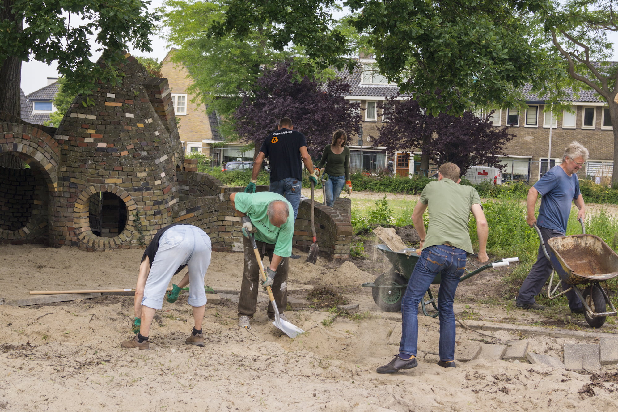 Zaterdagmorgen 16 juni was het dan zover. Een aantal omwonenden van het Julianapark hebben de eerste stap gezet. De focus lag in het opknappen van de kasteelruïne en het onkruid eromheen weghalen. Eerder had het Keurmerkinstituut het speeltoestel geïnspecteerd en was verbaasd over de kwaliteit van de ruïne. Er dienden een aantal aanpassingen aan de ruïne gedaan te worden om het te kunnen behouden. In overleg met de gemeente Hillegom is afgesproken dat de omwonenden dit zelf aan zouden pakken. Zo moest de grond rondom het kasteel afgegraven worden en vervangen worden door valzand. Dat was een flinke klus die met veel plezier uitgevoerd werd.