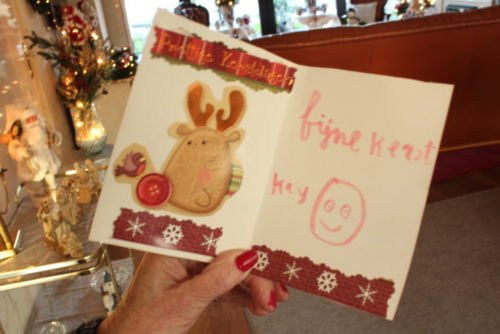 Ineens loopt ze naar de keuken, haalt een kerstkaart van het kastje af en laat hem zien.