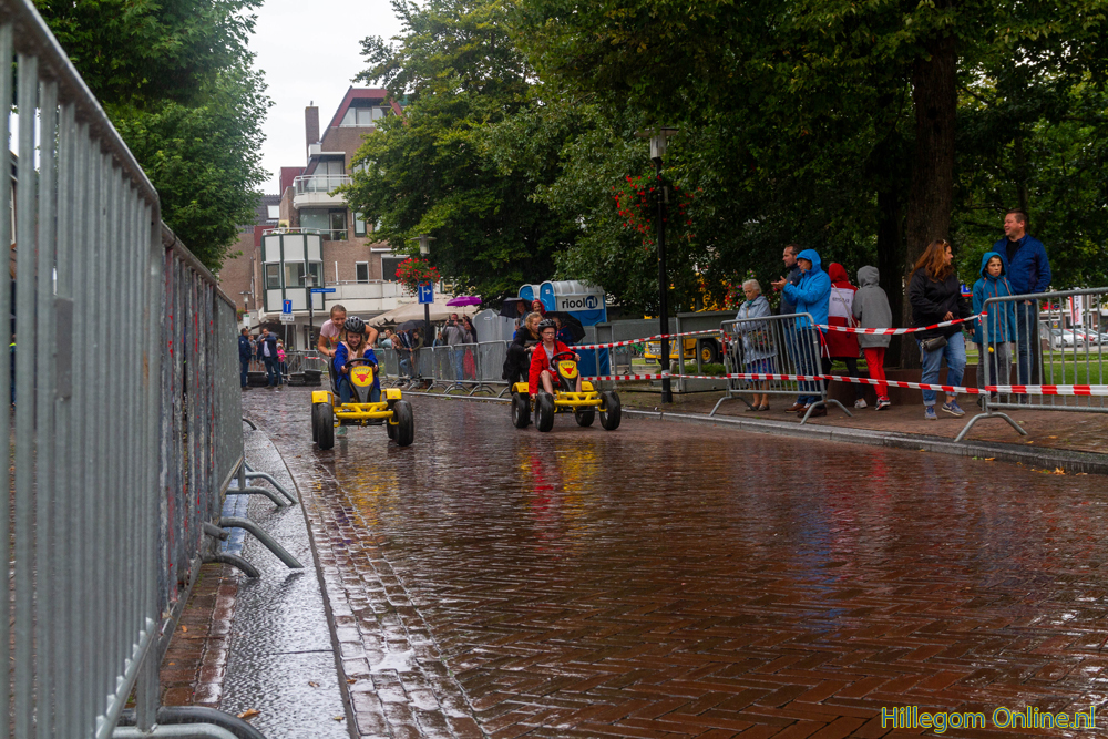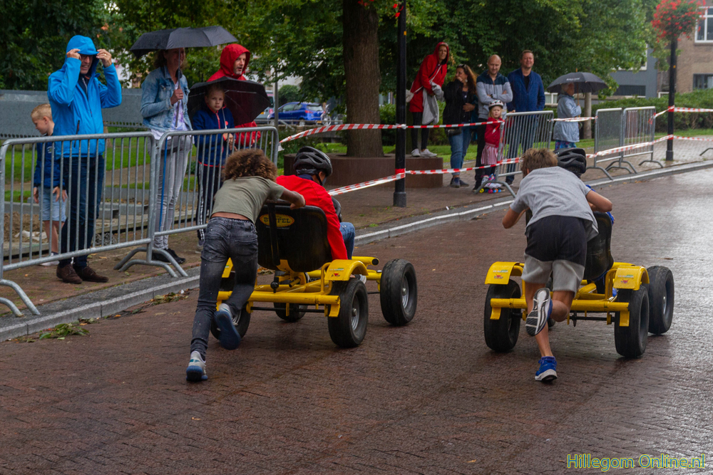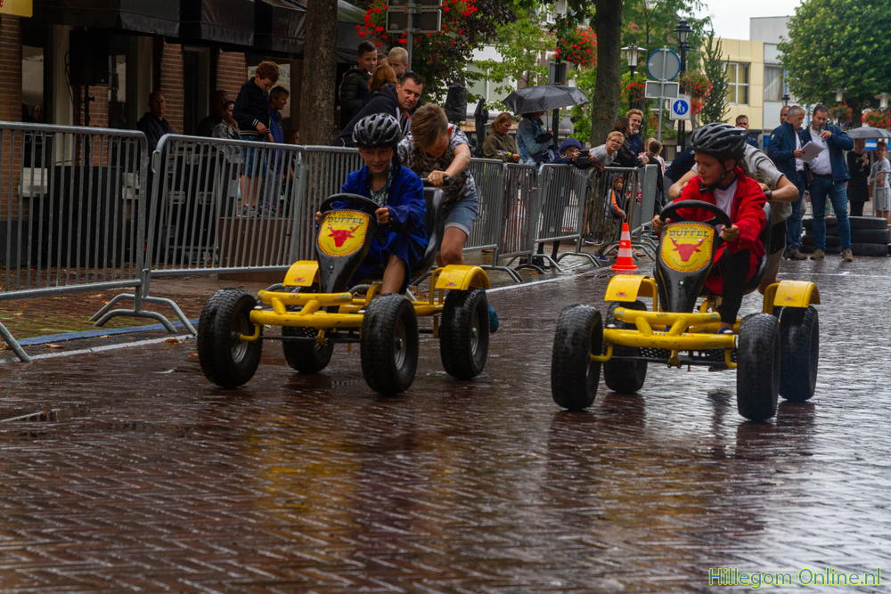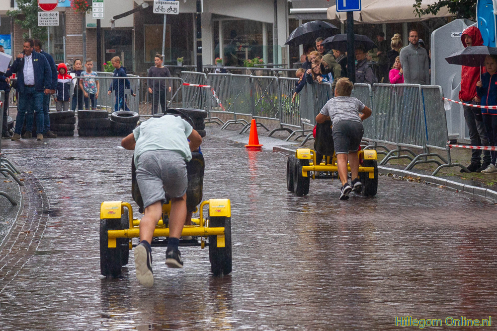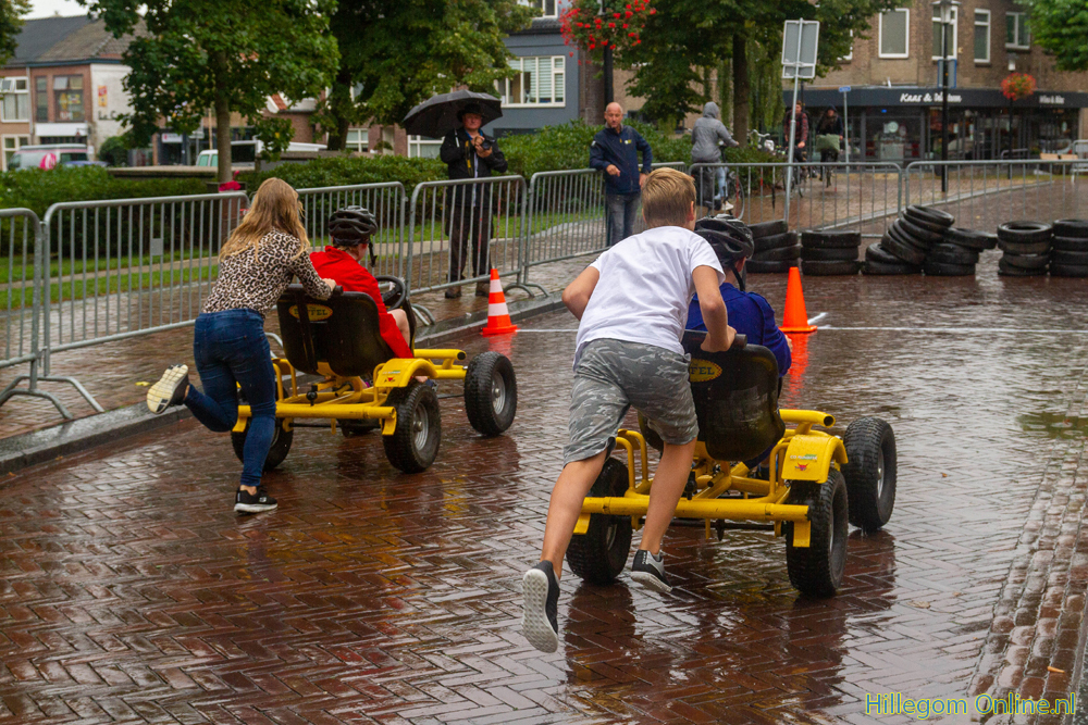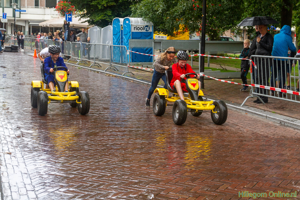 Hillegom – Voor het eerst vond de skelterrace plaats op de zondagmiddag in de Hoofdstraat. Een team bestond uit een duwer en bestuurder. Bij het keerpunt moesten de duwer en bestuurder wisselen. De overal moest snel uitgetrokken worden en door de ander aangetrokken. Door de regen was dit flink lastiger.