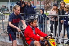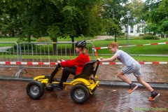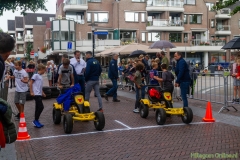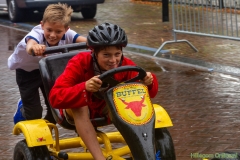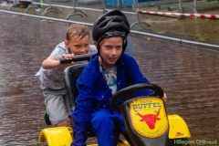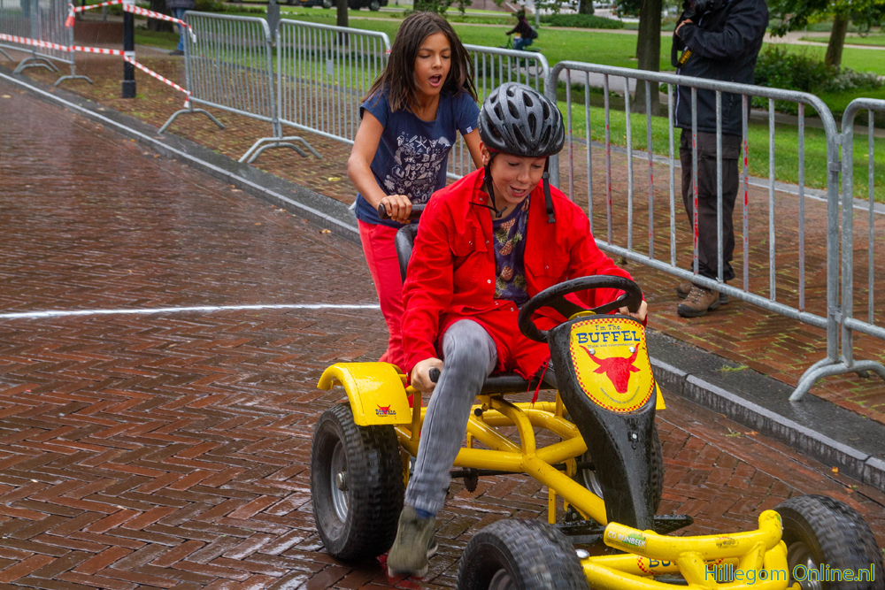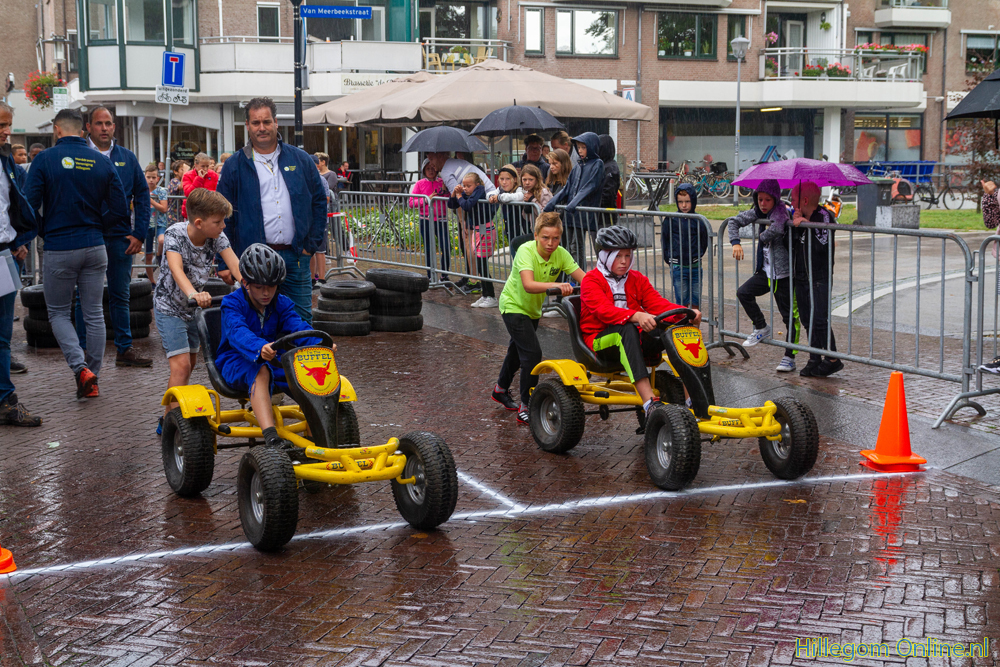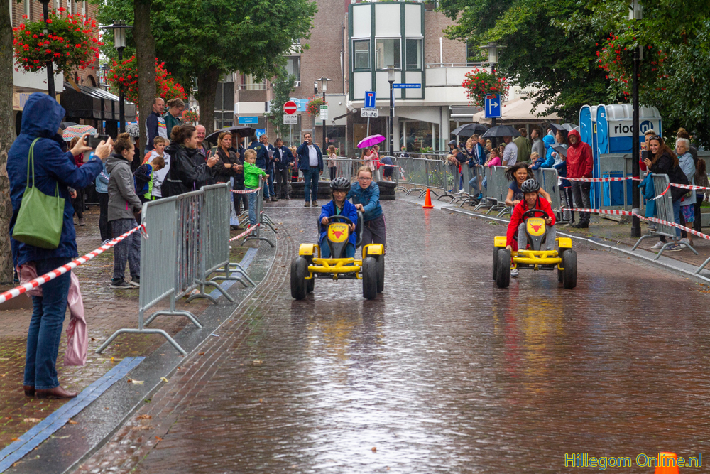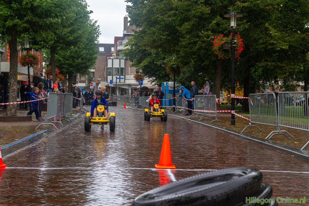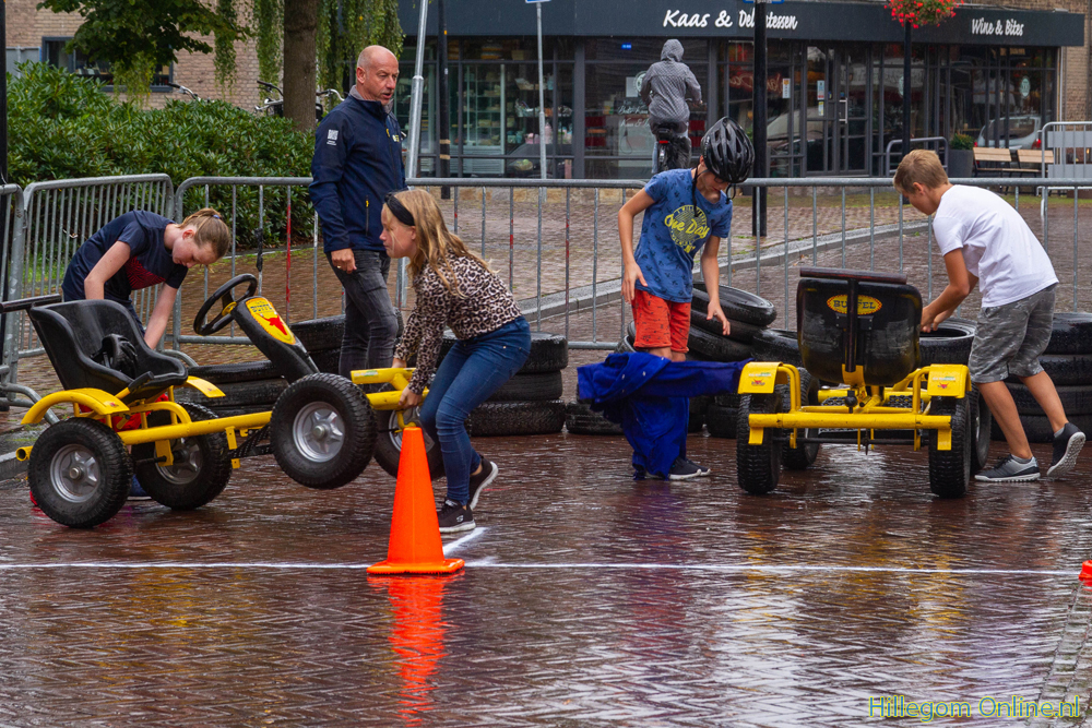 Hillegom – Voor het eerst vond de skelterrace plaats op de zondagmiddag in de Hoofdstraat. Een team bestond uit een duwer en bestuurder. Bij het keerpunt moesten de duwer en bestuurder wisselen. De overal moest snel uitgetrokken worden en door de ander aangetrokken. Door de regen was dit flink lastiger.