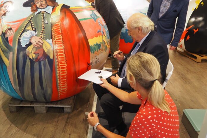 Streek – Afgelopen woensdagmiddag 09 september heeft jonkheer Jan Six X de Reuzenbol gesigneerd, die in opdracht van de Gemeente Hillegom wordt gemaakt door kunstenares Nicoline Heemskerk. Deze Reuzenbol is 1.85 meter hoog en onderdeel van het project GIANT TULIP BULBS van de Gildemeesters Bollenstreek.