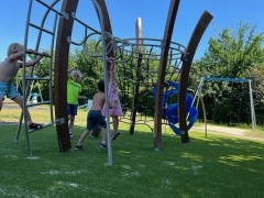 Oudere bezoekers herinneren zich nog de familieschommel die hier jarenlang stond. Omdat deze niet meer voldeed aan de eisen van de huidige tijd, maakte deze ruimte voor een nieuw klimtoestel. Die werd op deze zomerse dag naar hartelust beklommen.