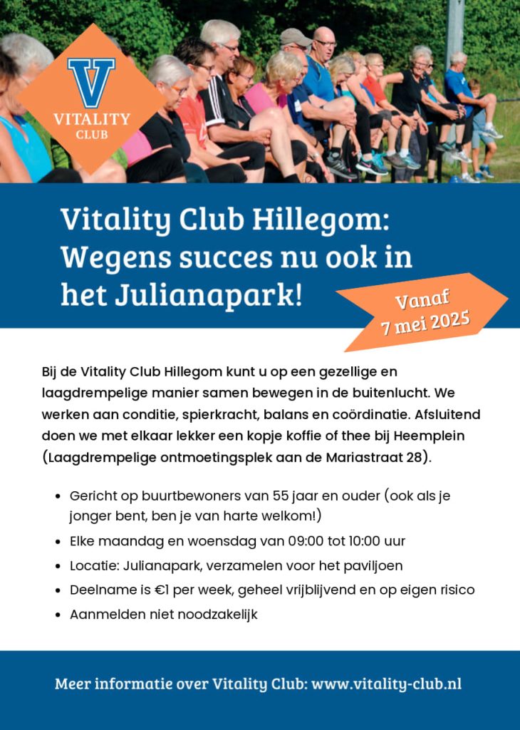 Vanaf 7 mei 2025 is de Vitality Club weer van start gegaan. Iedere maandag en woensdag om 09:00 uur kun je meedoen met laagdrempelige en gezellige beweegmomenten in het Julianapark. Na afloop is er een mogelijkheid om samen koffie of thee bij Heemplein te drinken. De warme koffie staat klaar!