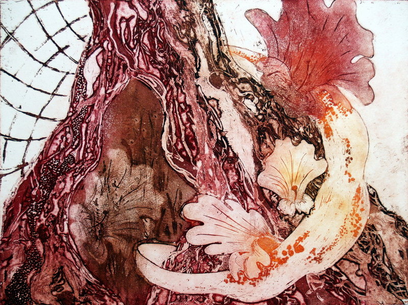 Janine Lamers maakt veel werk in deze stijl. Voor de expositie in de bibliotheek in Hillegom heeft ze een unieke collectie kleurenetsen samengesteld. Ze dragen titels als “In-vloed” en “Dansend de zomer in”. Ook “Stromend” en zelfs “Heimwee” is uitgebeeld.