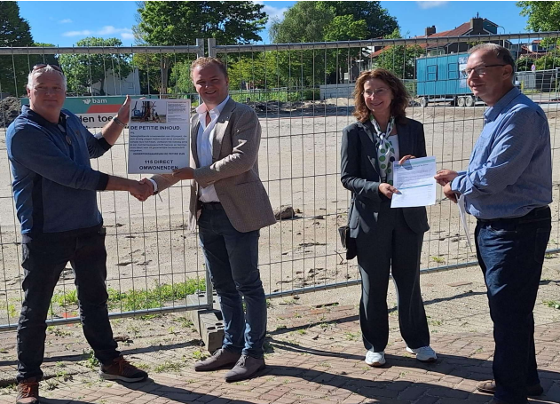 Afgelopen woensdag (28 mei) werd door de heren Versteegt en Brandsma namens de 117 bezorgde direct omwonenden een petitiebord en ondertekende petitie overhandigd aan wethouder dhr. M. Roelofs (Wonen) en Mevr. K. Hoekstra (Omgevingswet). Door de wethouders en de gemeente is aan de belanghebbende omwonenden aangegeven dat