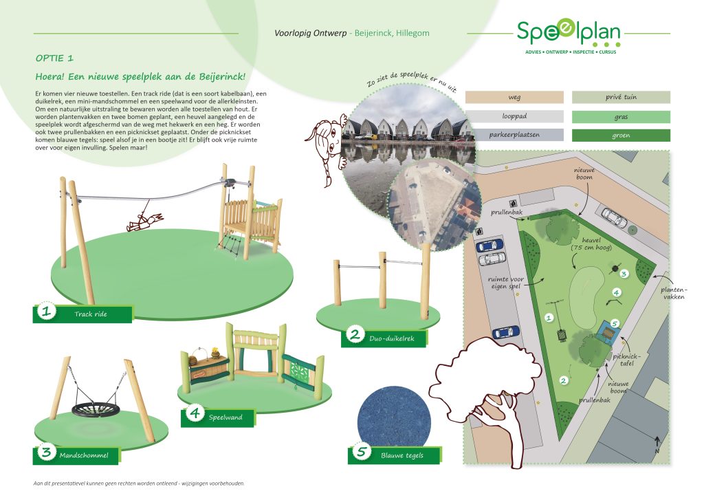 Uit de stemming blijkt dat ontwerp 1 de meeste stemmen heeft gekregen. In dit ontwerp staan de volgende speeltoestellen:
