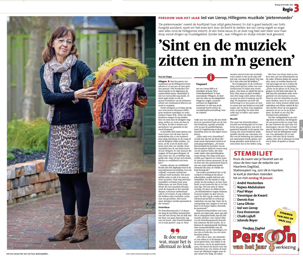 Hillegom – Hillegomse muziek- en Sinterklaasvrijwilliger Ied van Lierop is door het Haarlems Dagblad genomineerd voor de titel Persoon van het Jaar. Dat meldt de krant in een uitgebreid portret in de editie van dinsdag 30 december. Van Lierop is de enige Hillegommer die dit jaar genomineerd is.