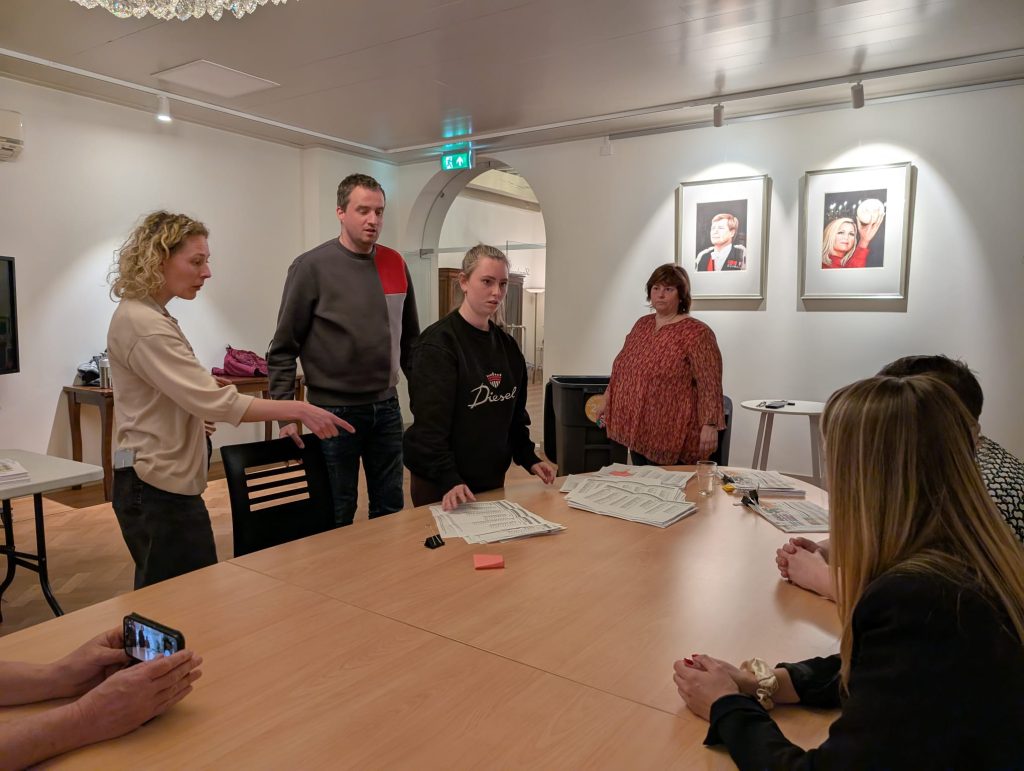 Er wordt druk geteld. Ook vlak naast de uitslagenavond in ’t Hof van Hillegom zijn ze druk aan het tellen. Eerst wordt er gekeken of er even veel stembiljetten als stempassen zijn. Daarna zullen ze per partij gaan tellen. Morgen in sporthal De Vosse zullen ze per kandidaat gaan stemmen.