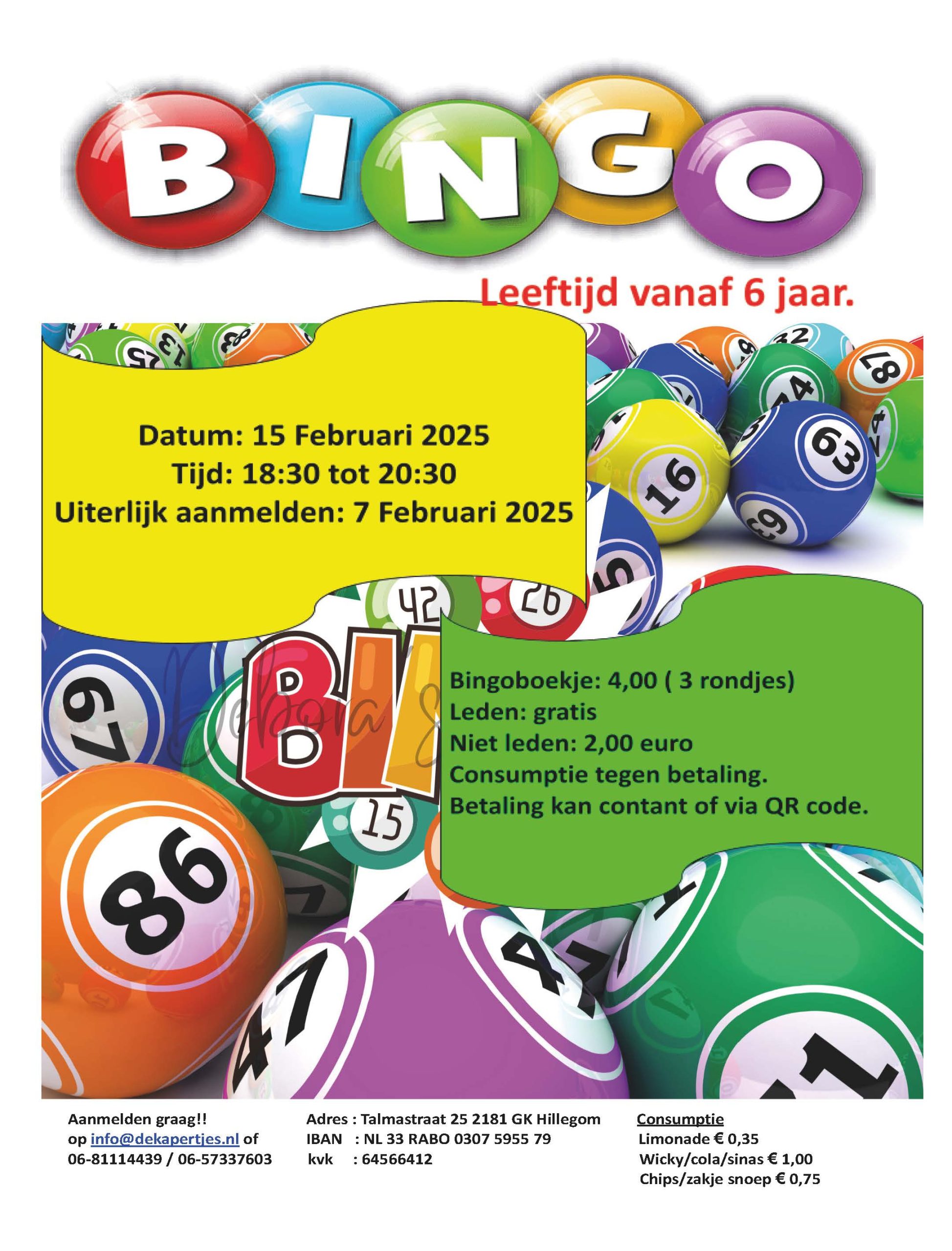 Op zaterdag 15 februari 2025 staat er een gezellige bingo-avond gepland bij de Kapertjes, geschikt voor iedereen vanaf 6 jaar. De avond vindt plaats in het gebouw aan de Talmastraat 25 en begint om 18:30 uur. De bingo duurt tot ongeveer 20:30 uur. Het belooft een leuke activiteit te worden voor jong en oud, met mooie prijzen in het vooruitzicht.