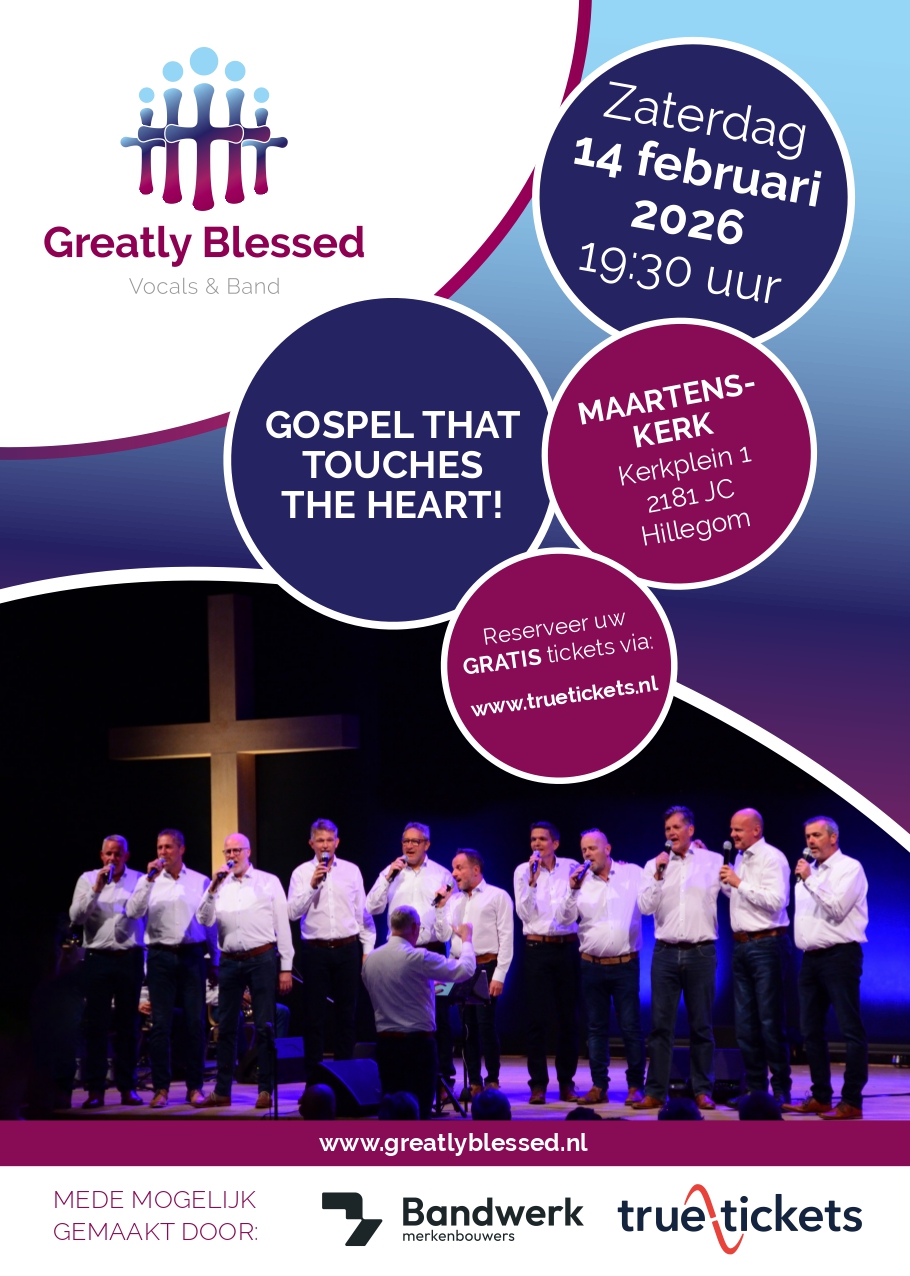Op Valentijnsdag 14 februari om 19.30 uur staat in Hillegom een fantastisch concert gepland. De mannen van Greatly Blessed zullen dan optreden in de Maartenskerk.