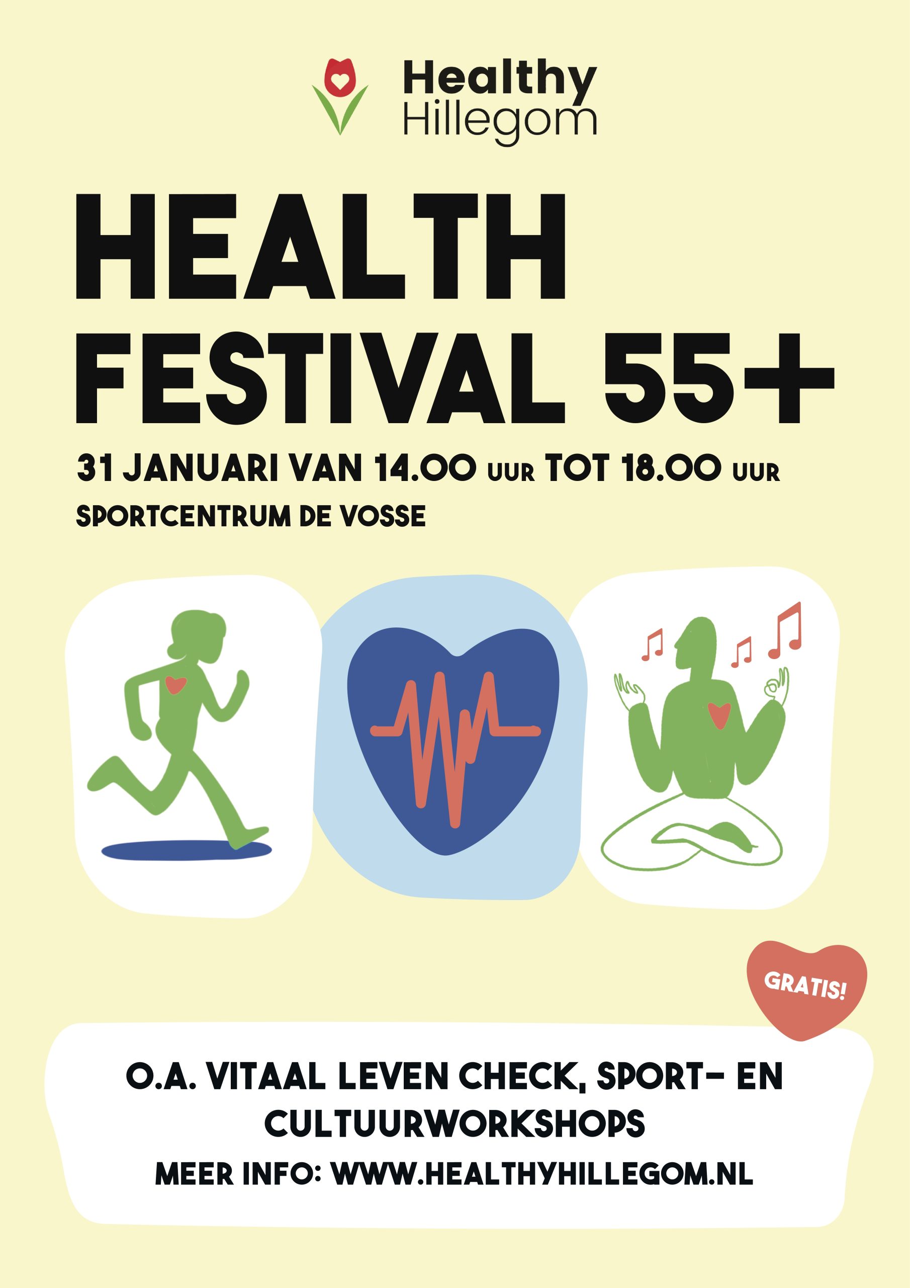 Op zaterdag 31 januari organiseert Healthy Hillegom voor het eerst het Health Festival in Sportcentrum De Vosse in Hillegom. Van 14.00 uur tot 18.00 uur zijn inwoners uit Hillegom van 55 jaar en ouder welkom om gratis deel te nemen aan dit gezondheidsfestival, dat in het teken staat van een gezond en vitaal 2026.