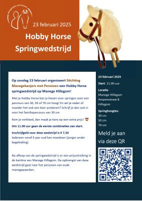 Op zondagochtend 23 februari 2025 organiseert stichting Manegekanjers met Pensioen weer een hobby horse springwedstrijd op Manege Hillegom. En omdat het bijna carnaval is, kan je natuurlijk verkleed komen! Voor de mooiste uitdossing hebben we een extra prijs!