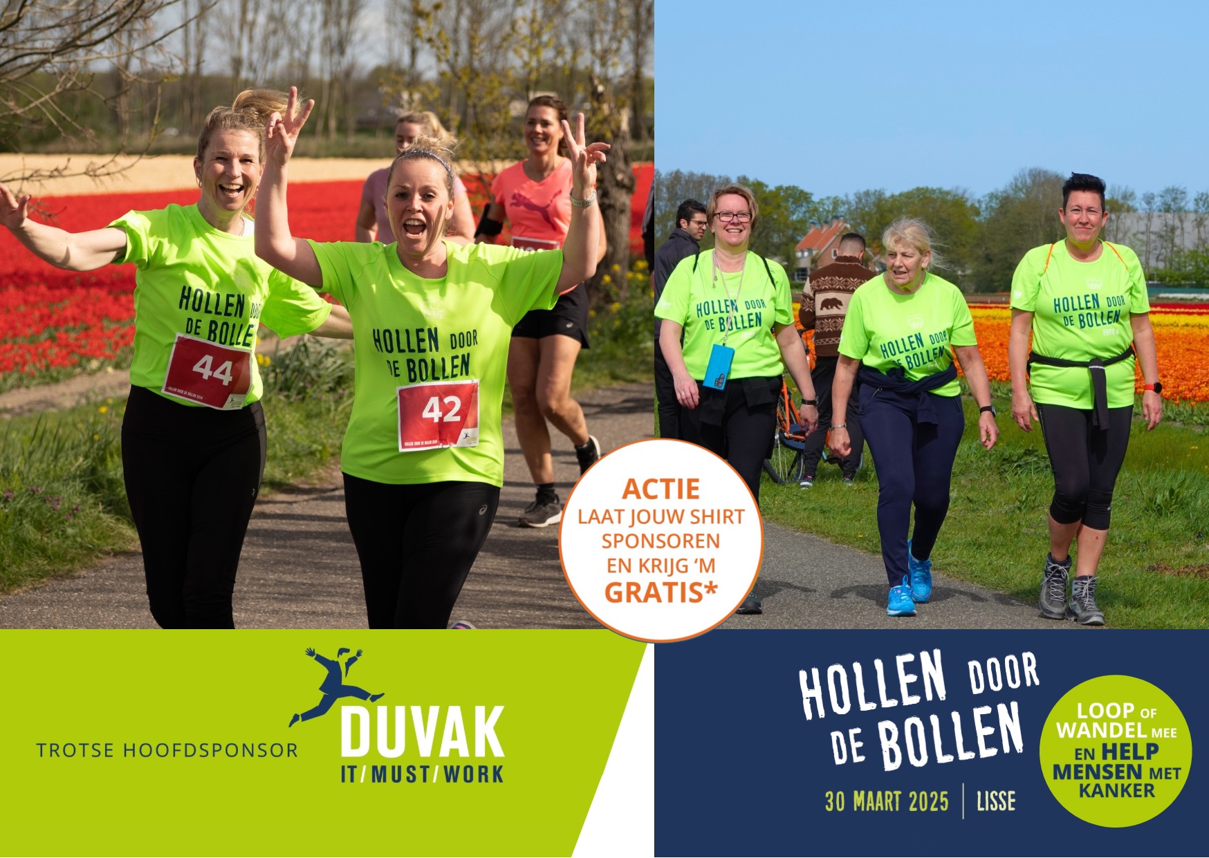 Bloeiende bollenvelden in het voorjaarszonnetje! Een super parcours voor de prestatielopen en prachtige routes voor de wandelafstanden. Hollen door de Bollen wordt jaarlijks georganiseerd door het Roparun Team Bollenstreek met onmisbare medewerking van AV De Spartaan, vrijwilligers en sponsoren! De hele opbrengst van het evenement komt ten goede van Stichting Roparun die palliatieve zorg voor kinderen en volwassen met kanker ondersteunt, zie www.roparun.nl.
