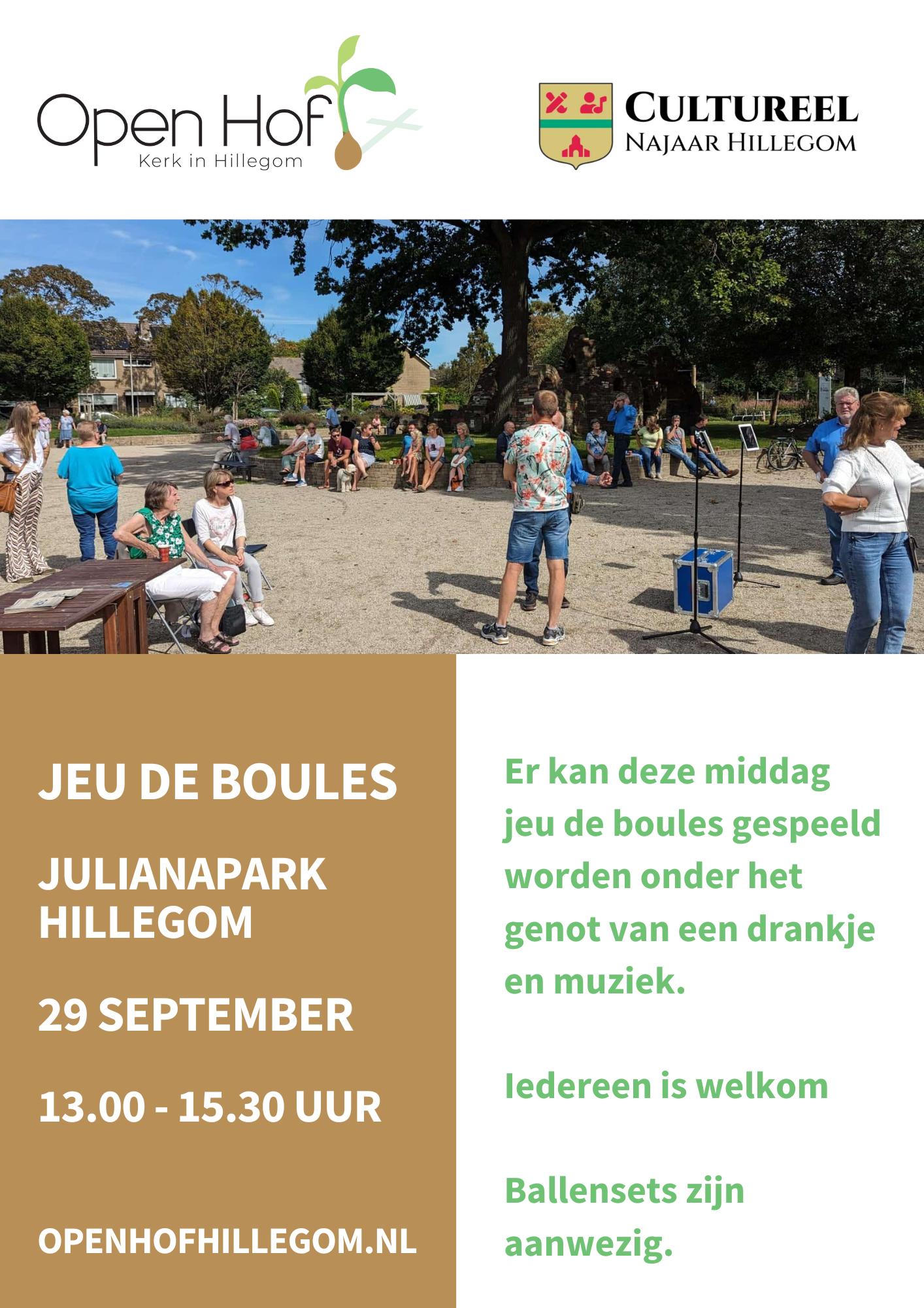 Iedereen, jong en oud, is van harte welkom om wat te komen drinken of een spelletje jeu de boules te komen spelen. Wie gezellig een praatje wil maken of andere mensen wil ontmoeten kan ook terecht in het park. Er zijn enkele jeu de boules spellen aanwezig. Maar als u een eigen jeu de boules spel heeft, kunt u deze ook meenemen. Het Julianapark is aan de Oranjelaan 1 in Hillegom. Bij nat weer gaat de middag niet door.
