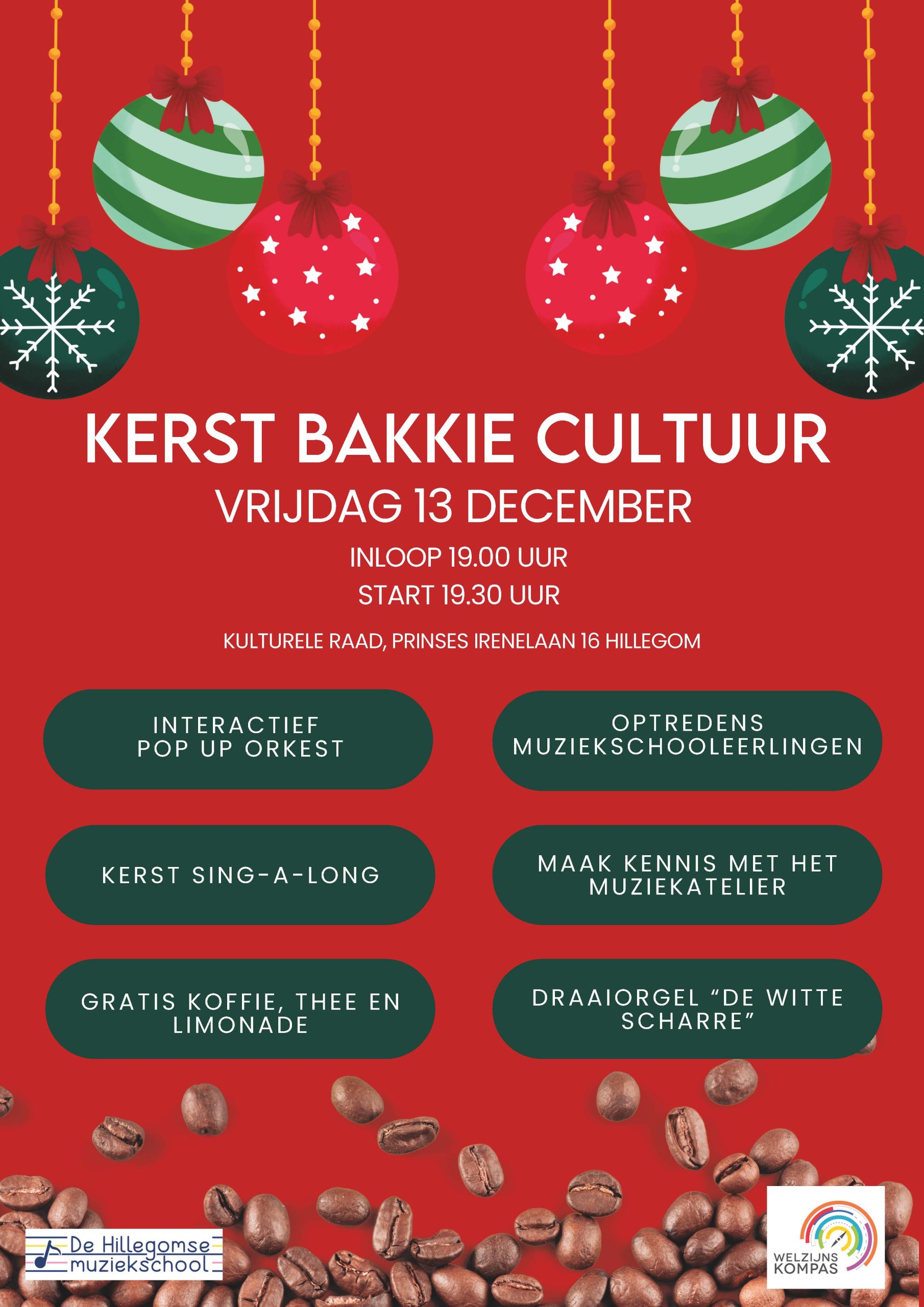 Hillegom – Vrijdag 13 december organiseert de Hillegomse Muziekschool een kerstevenement: Kerst Bakkie Cultuur. Maar wat is dat dan Kerst Bakkie Cultuur? Wie geniet er niet van kerstmuziek? De één vindt het heerlijk om te luisteren en de ander zingt of speelt juist zelf graag mee. Dat is Kerst Bakkie Cultuur!