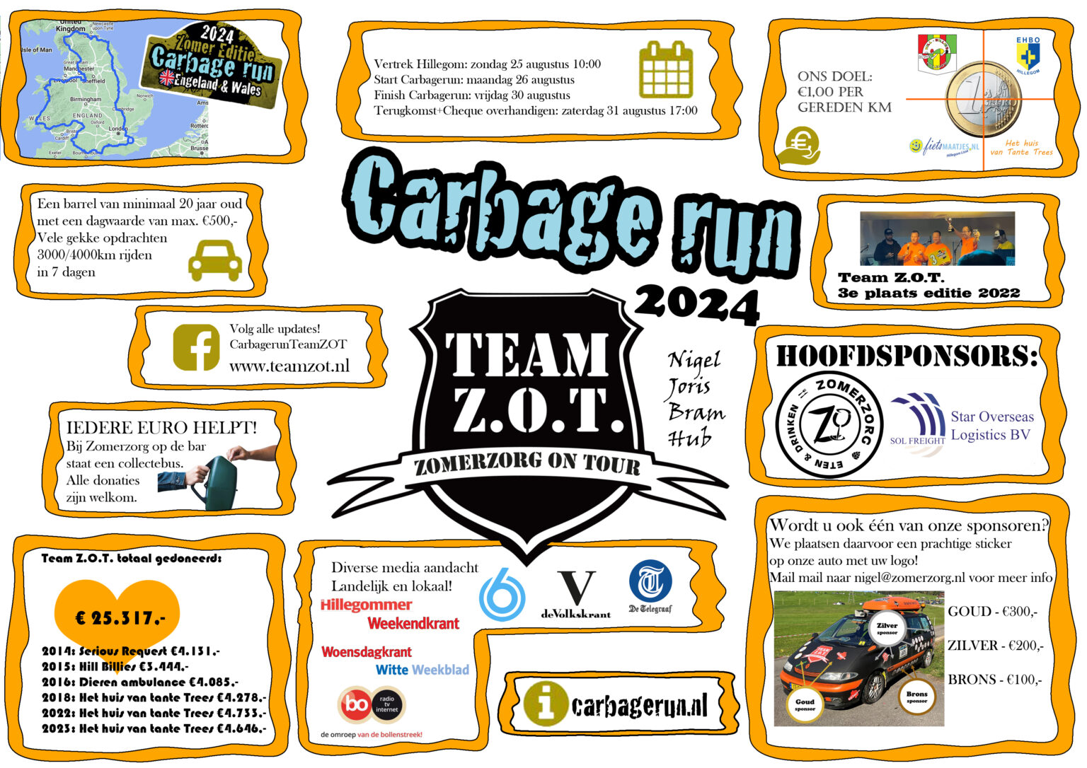 Voor de zevende keer doet team ZOT (Zomerzorg on Tour) mee met de Carbagerun. Zondag 25 augustus om 10u beginnen ze vanaf de parkeerplaats aan de Jonkheer Mockkade in hun 20 jaar oude barrel aan hun tour dwars door Europa. Voor iedere gereden kilometer doneren ze een bedrag aan het goede doel. Dit jaar zijn deze doelen Stichting Hill-Billies, Het huis van Tante Trees, Fietsmaatjes Hillegom-Lisse en de EHBO Hillegom.