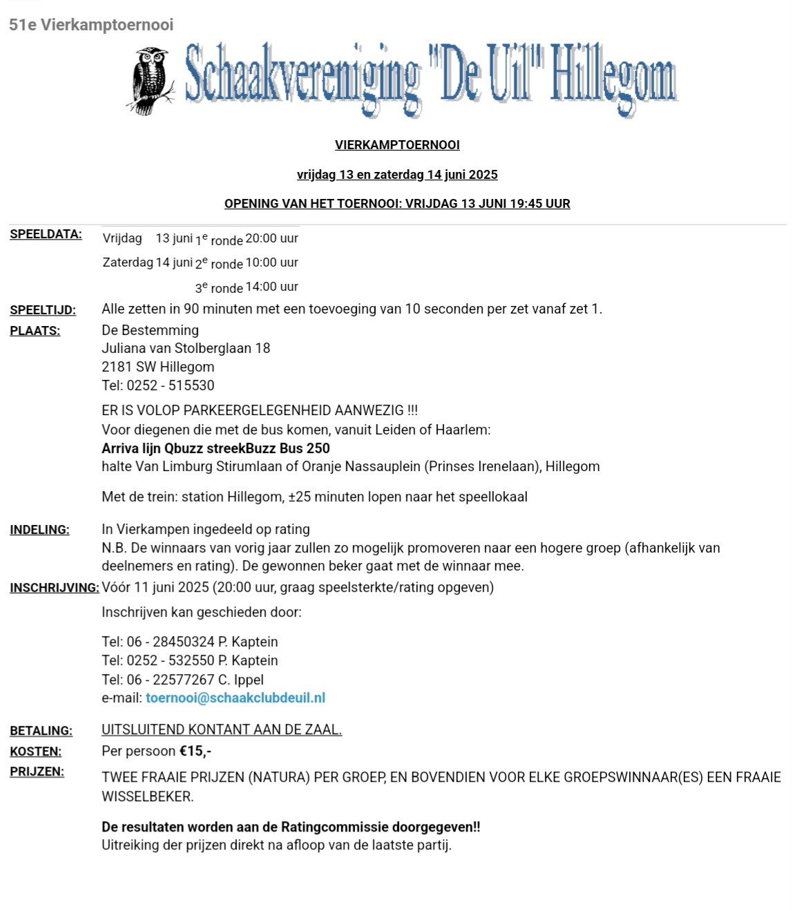 Schaakclub De Uil organiseert op vrijdagavond 13 juni en zaterdag 14 juni het Vierkampen Schaaktoernooi. In groepen van vier worden drie partijen gespeeld: op vrijdagavond, zaterdagochtend en -middag. De indeling gebeurt op speelsterkte. De groepswinnaars ontvangen een mooie wisselbeker en kunnen samen met de nummers twee een prijs kiezen van de prijzentafel. Deelname kost € 15,00. Catering is aanwezig. Aanmelden kan t/m 11 juni via toernooi@schaakclubdeuil.nl (vermeld je speelsterkte).
