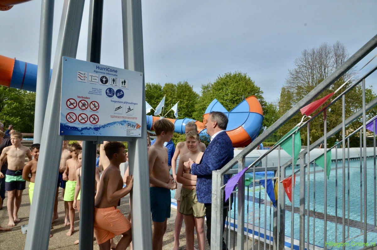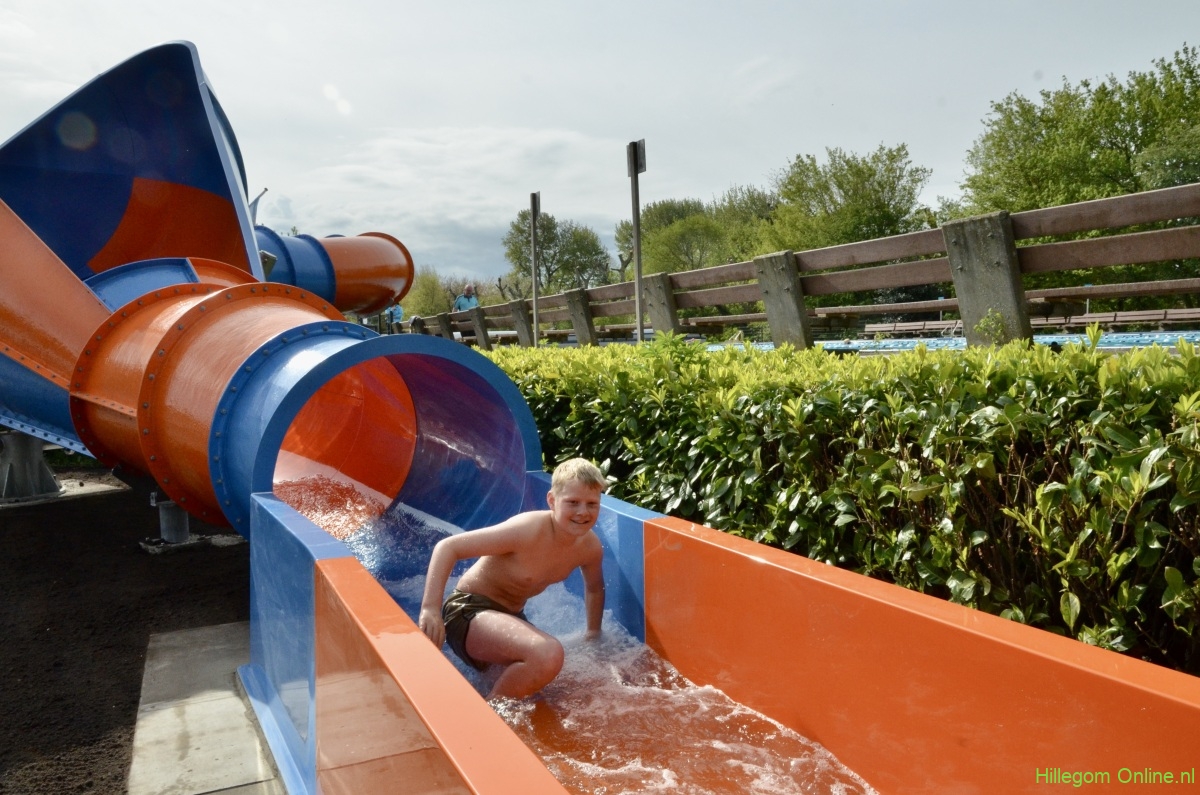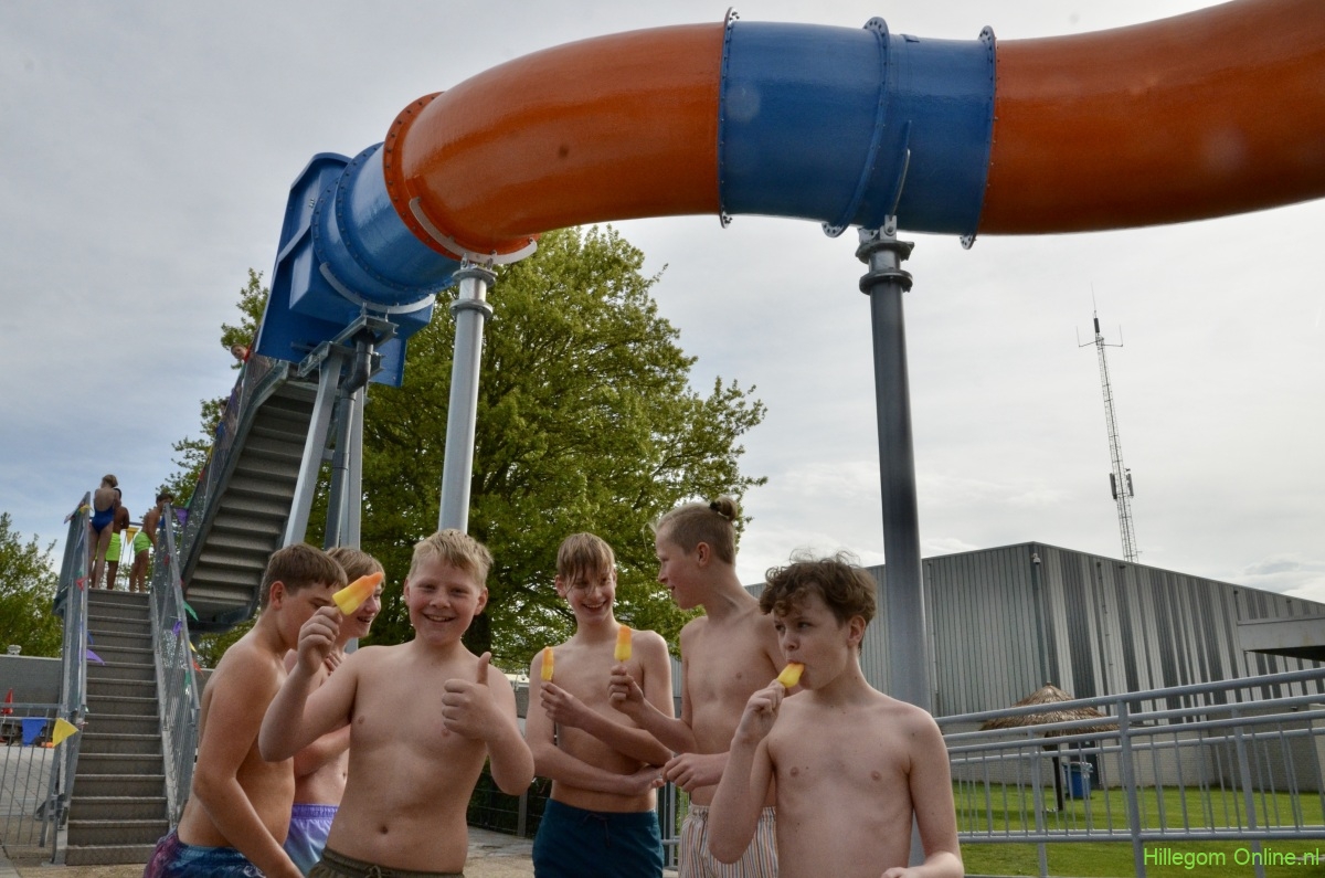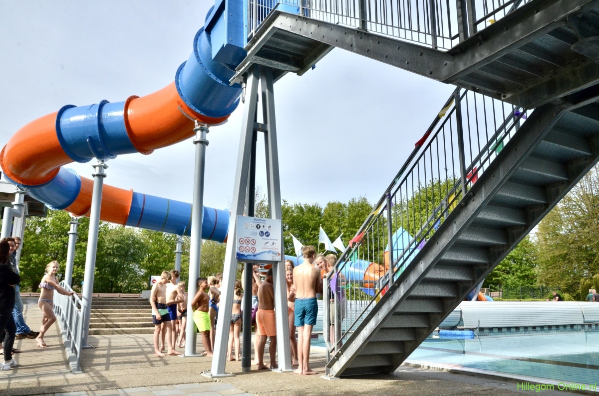 Terwijl wethouder Jan van Rijn aan kwam lopen kwamen steeds meer kinderen bij de glijbaan staan. De wethouder was duidelijk trots op het zwembad met deze vernieuwde attractie. Zo heeft Hillegom, met recht, het mooiste buitenzwembad van de regio.