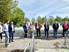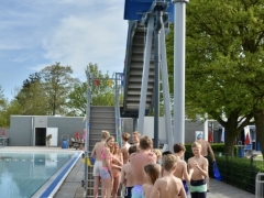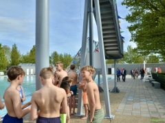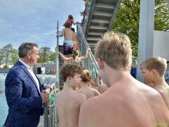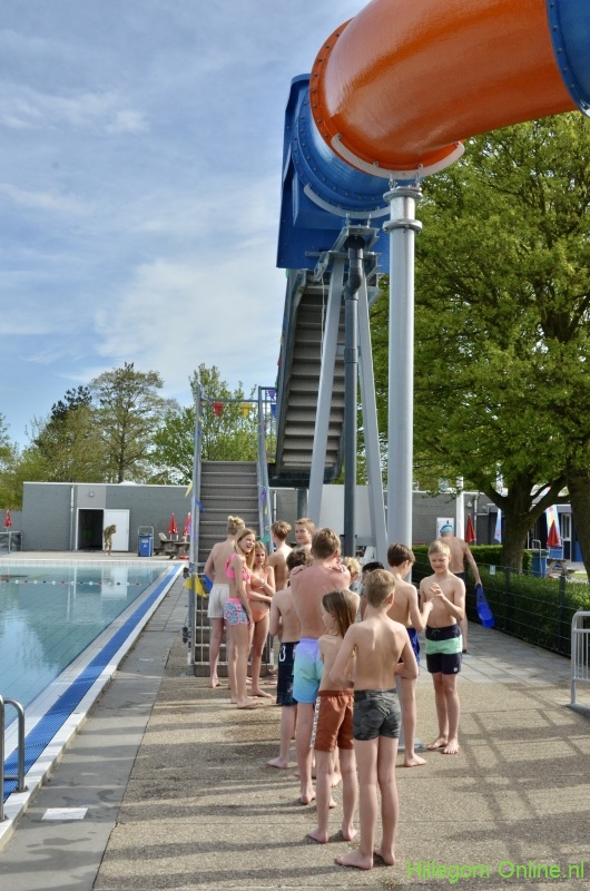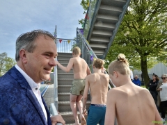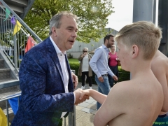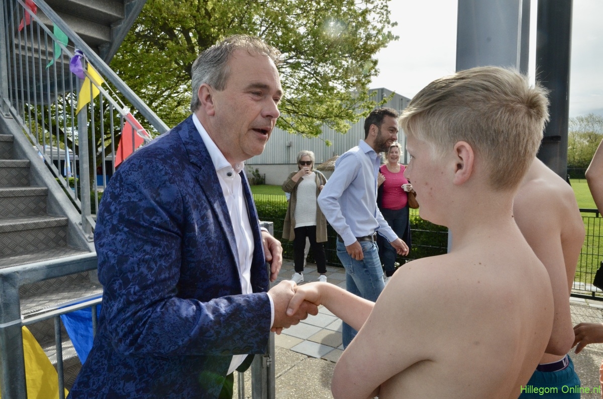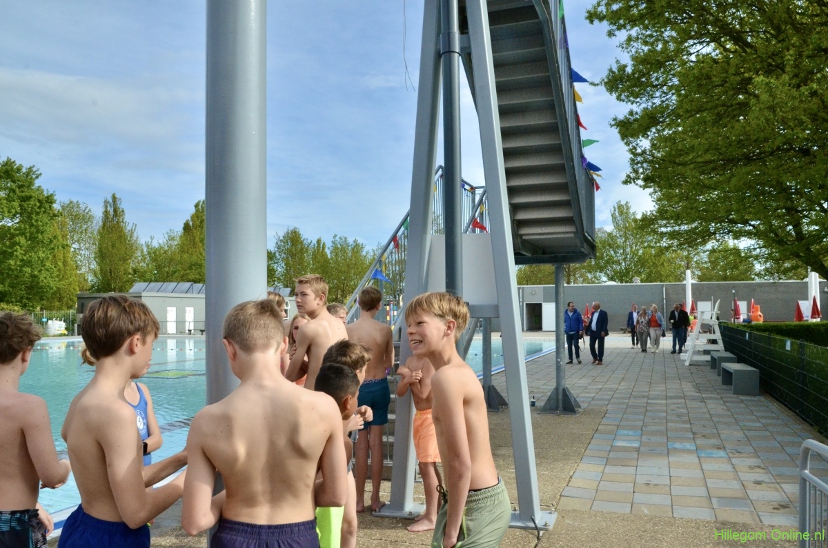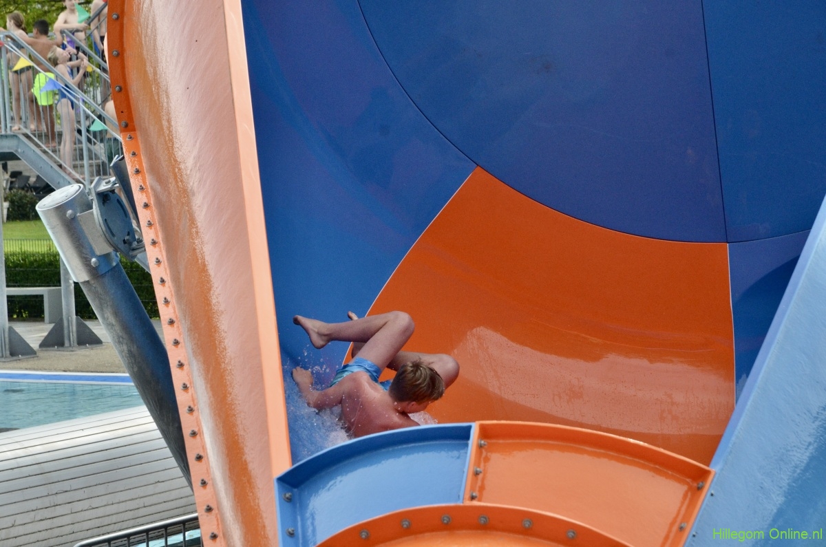 Terwijl wethouder Jan van Rijn aan kwam lopen kwamen steeds meer kinderen bij de glijbaan staan. De wethouder was duidelijk trots op het zwembad met deze vernieuwde attractie. Zo heeft Hillegom, met recht, het mooiste buitenzwembad van de regio.