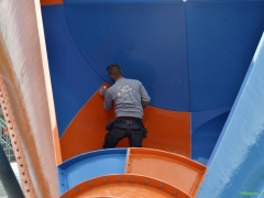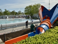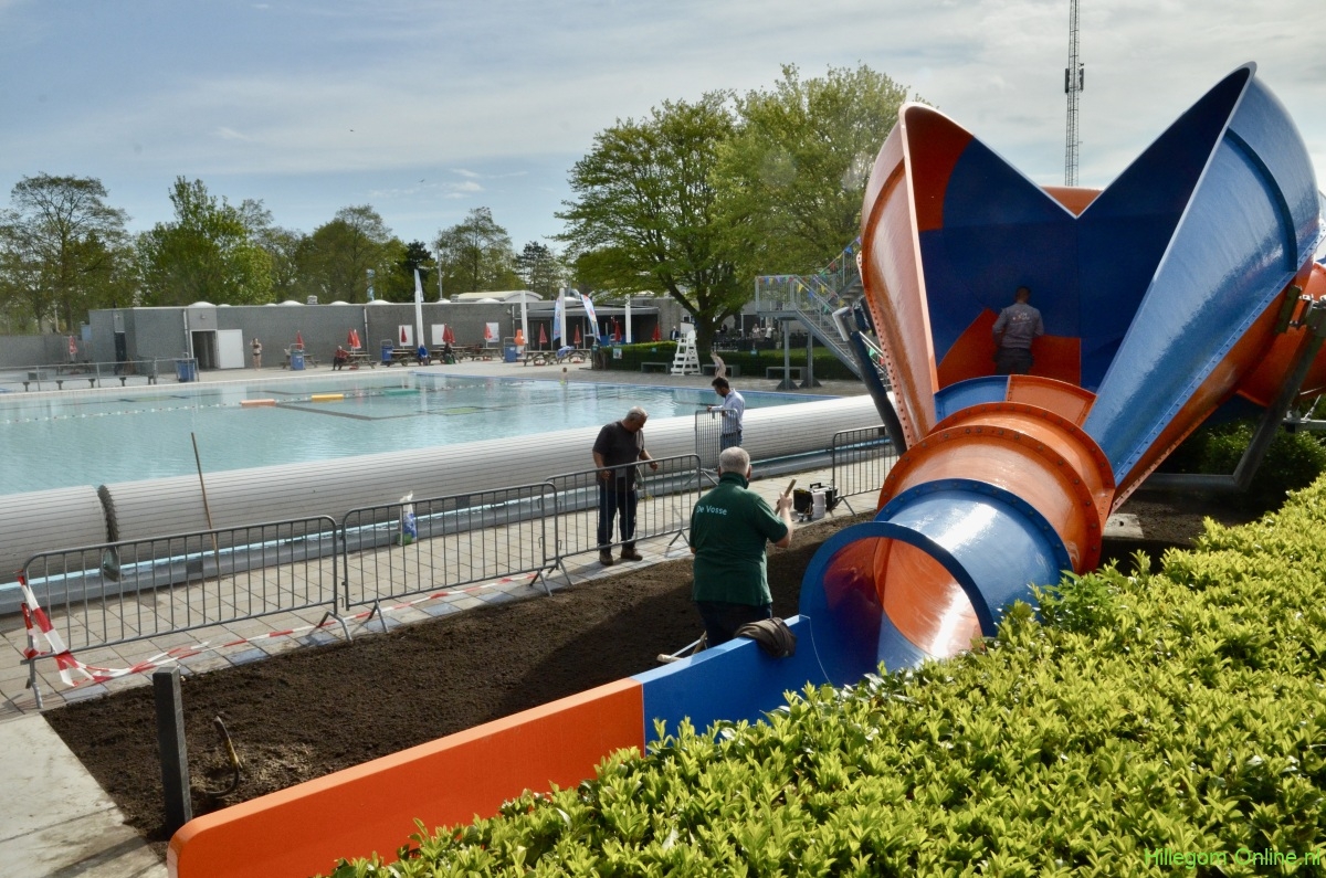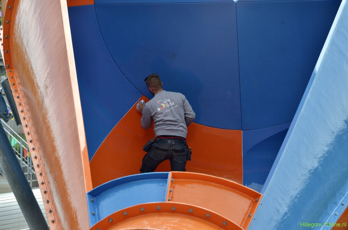 Hillegom – Vanmorgen om 10 uur stond er al een lange rij wachtenden voor de nieuwe oranje-blauwe glijbaan in de Vosse. Aan de andere kant van de, nog droge, glijbaan werden nog de laatste werkzaamheden verricht.