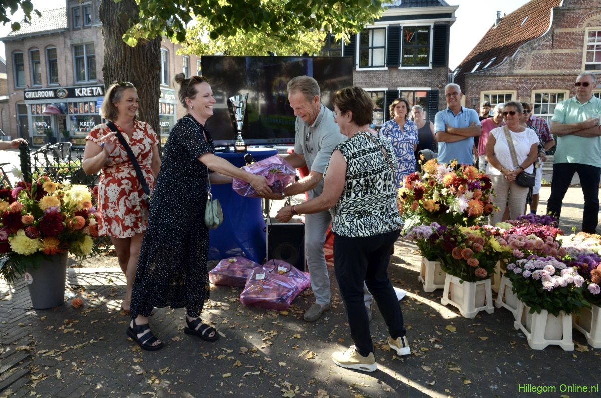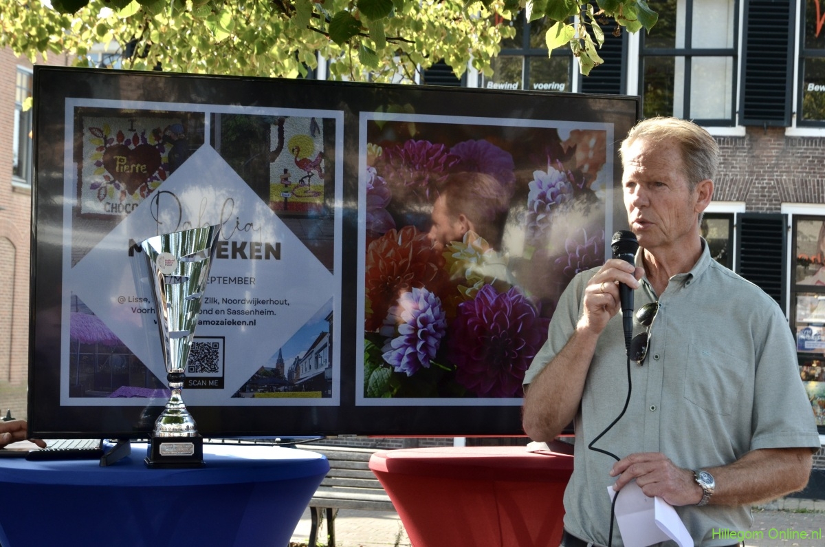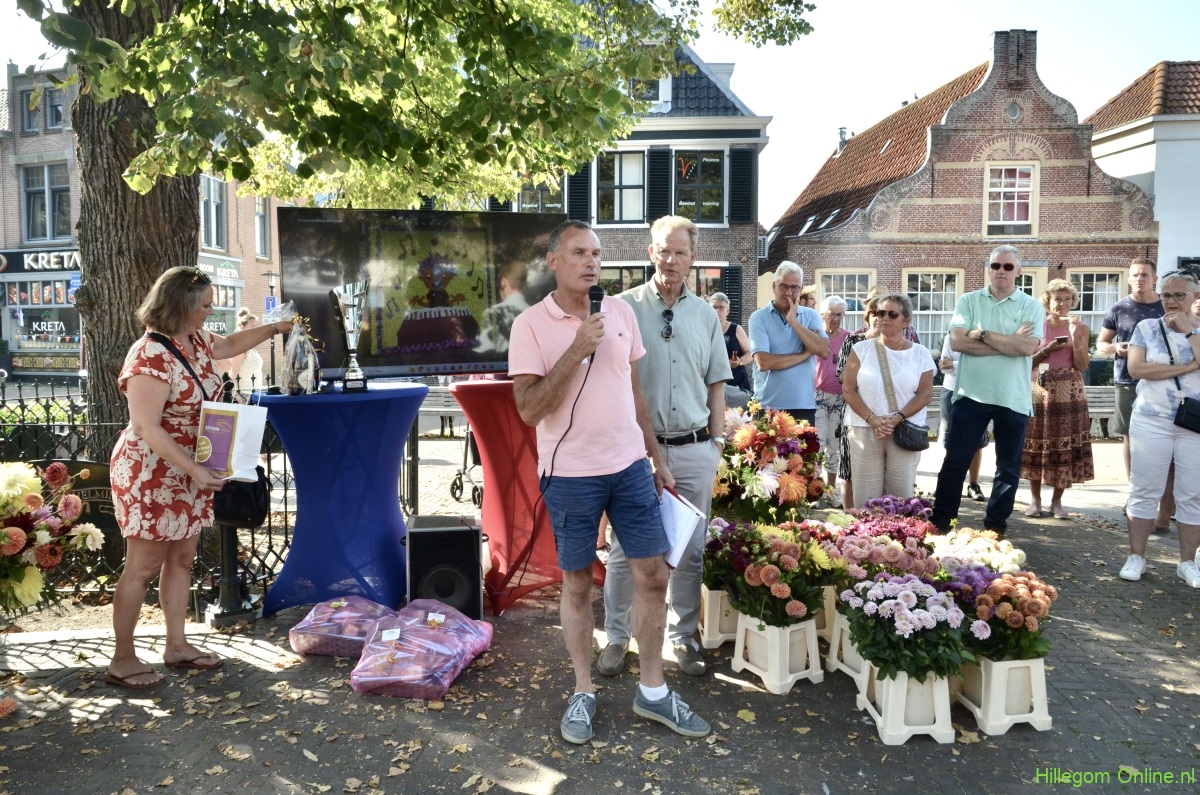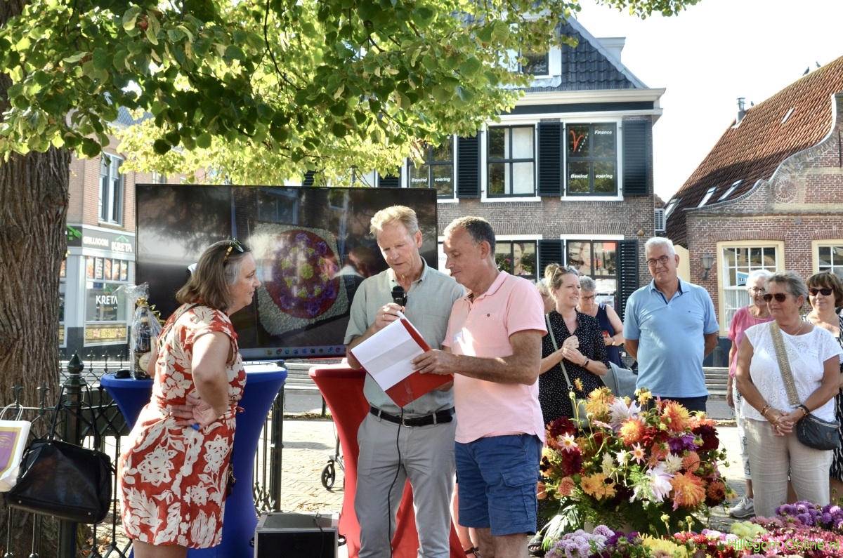 Hillegom – Op zaterdag 9 september om 16.00 uur was de prijsuitreiking van de Dahlia Mozaïeken bij de pomp in Hillegom. Wat zeven jaar geleden begon met vier dahlia Mozaïeken is dit jaar uitgegroeid tot een evenement met wel tweeënnegentig mozaïeken. Vanaf woensdag werd er dus druk gestoken In de regio. De jury heeft vandaag alle mozaïeken bezocht. Er waren prijzen voor Hillegom. Voor Lisse en voor de regio. In Hillegom was de eerste prijs voor Bloembinderij van der Post.