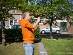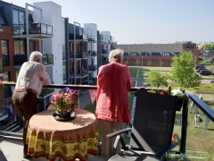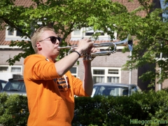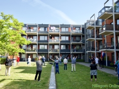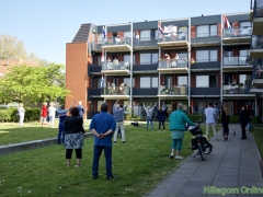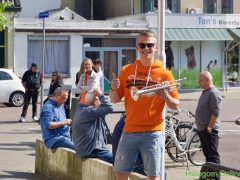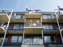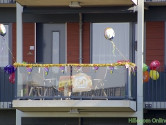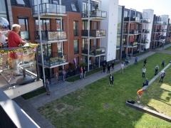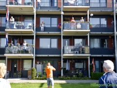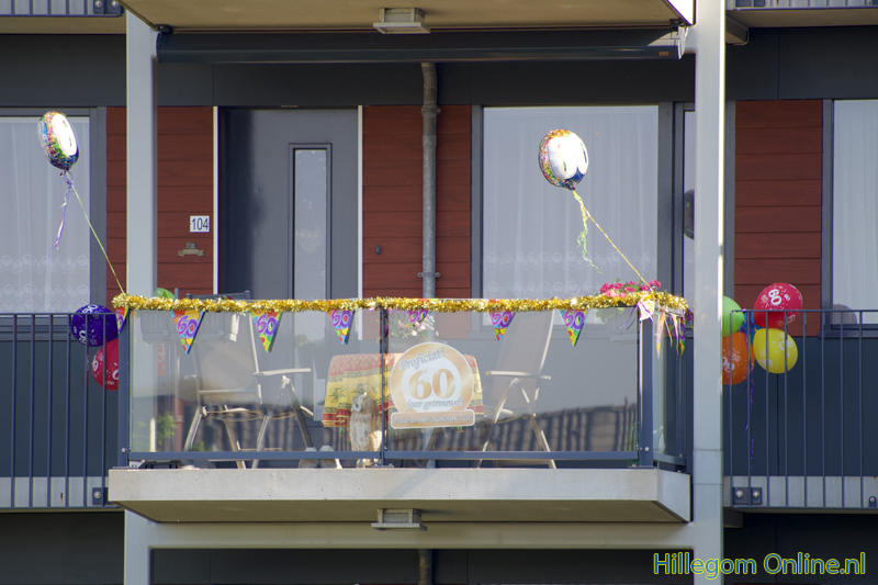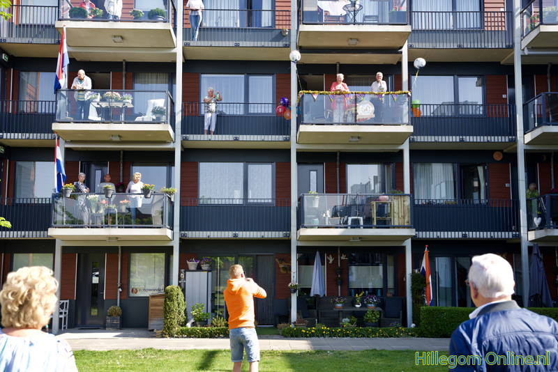 Op een mooi versierd balkon stond het echtpaar in de zon te genieten wat er allemaal voor ze was geregeld. Zo was ook Jeffrey Parmentier opgetrommeld om trompet voor ze te spelen. Het stond vol beneden met natuurlijk iedereen op 1,5 meter afstand.