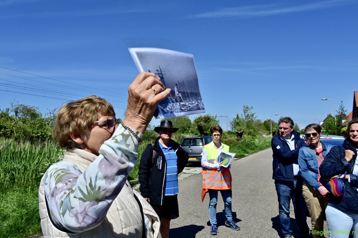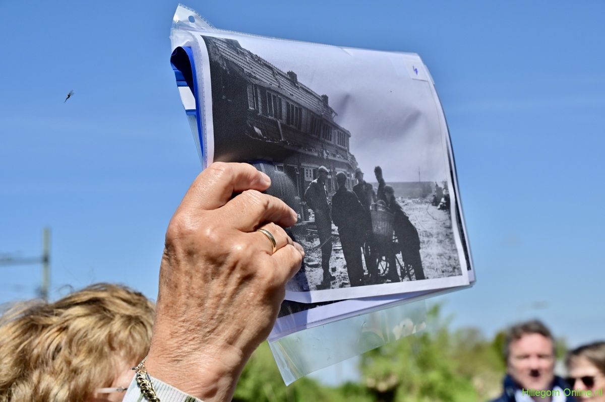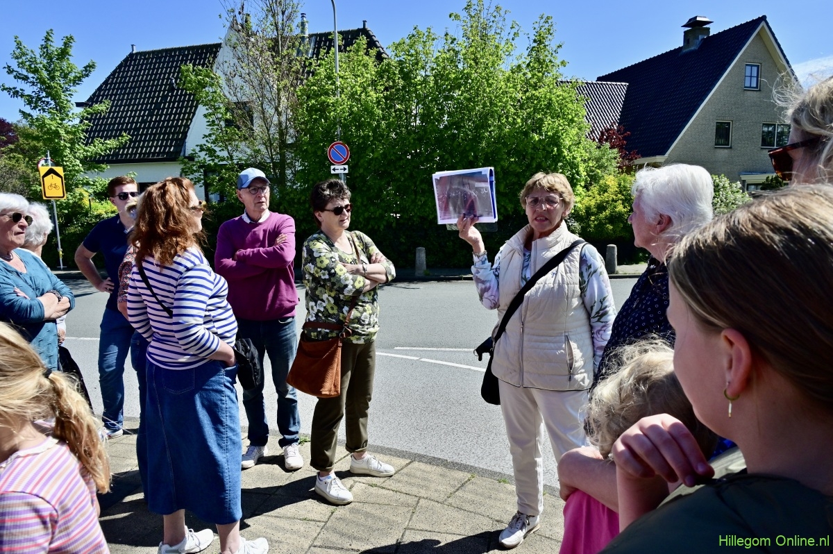 Hillegom – De bevrijdingswandeling begon aan de Stationsweg. Daar werd, onder andere, het verhaal verteld van de dames van Vliet. We wandelden verder over de parallelweg, waar duidelijk nog de herinnering van een bominslag van maart 1945 te zien was.