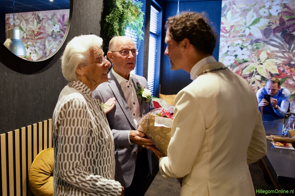 Hillegom – Bruidspaar Kunne-Timmers vieren vandaag hun 65-jarige trouwjubileum in Hotel Villa Flora. Burgemeester Ter Hark kwam daar het bruidspaar feliciteren met dit bijzondere jubileum.
