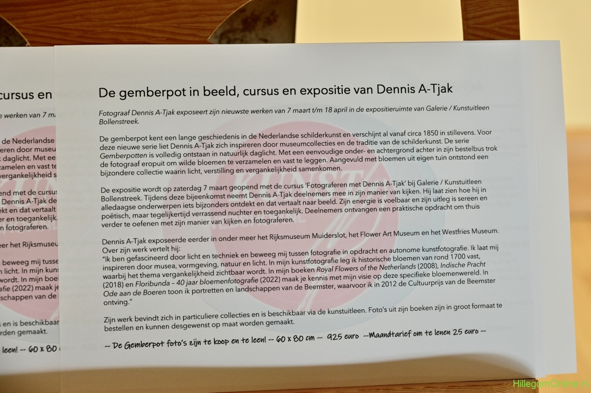De expositie Gemberpot in beeld bij Kunstuitleen Bollenstreek startte zaterdag spectaculair met een fotocursus van kunstenaar Dennis A-Tjak. Zijn werk, ook te zien in diverse musea, vormt een hommage aan de Nederlandse stilleventraditie waarin de gemberpot sinds circa 1850 een iconisch motief is.