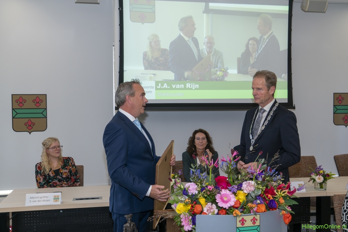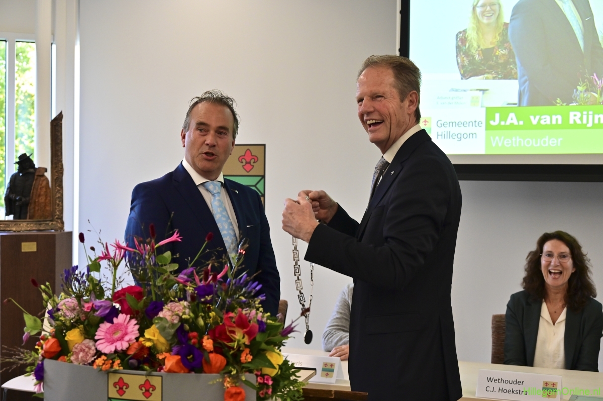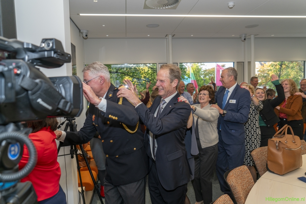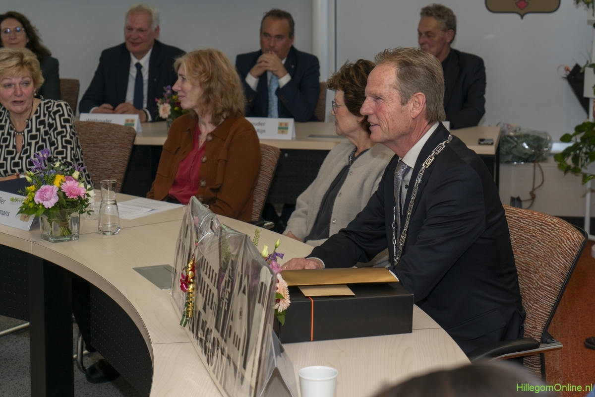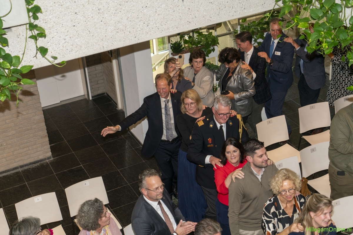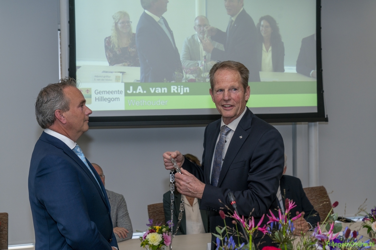 In diverse speeches hoorden we over zijn enorme inzet en warme betrokkenheid. Wethouder Jan van Rijn overhandigde de burgemeester de Hillegomse Hangkous, als dank voor zijn jarenlange inzet. Nadat de burgemeester zelf nog had gesproken was het tijd de ambtsketting af te leggen. Jan van Rijn kreeg de ketting omgehangen, hij neemt de functie van burgemeester waar, totdat begin november de nieuwe burgemeester zal worden geïnstalleerd.