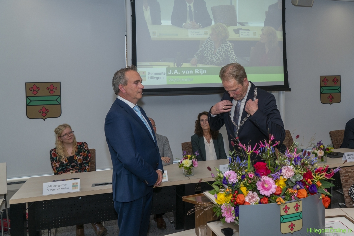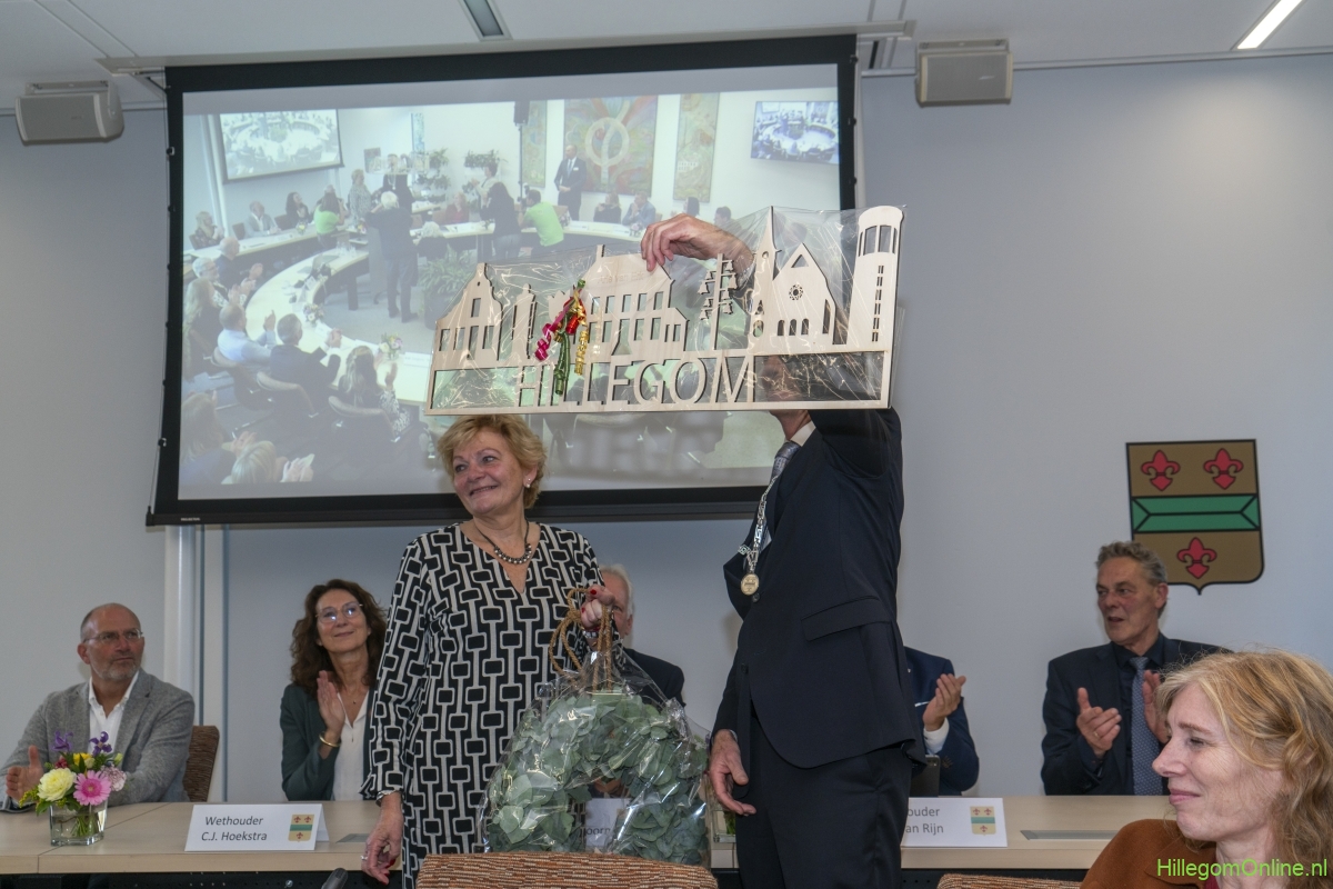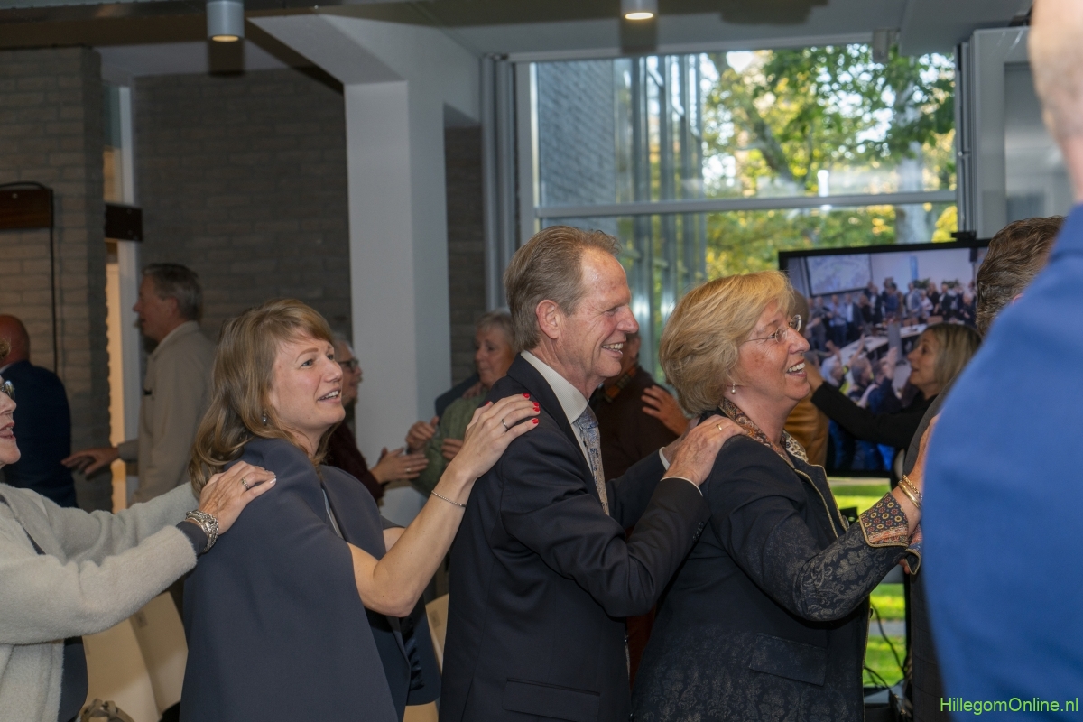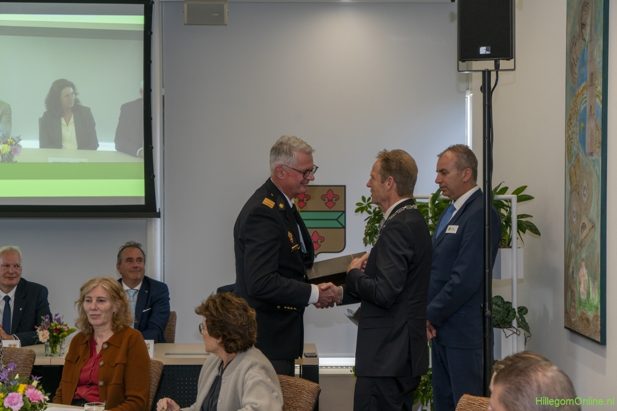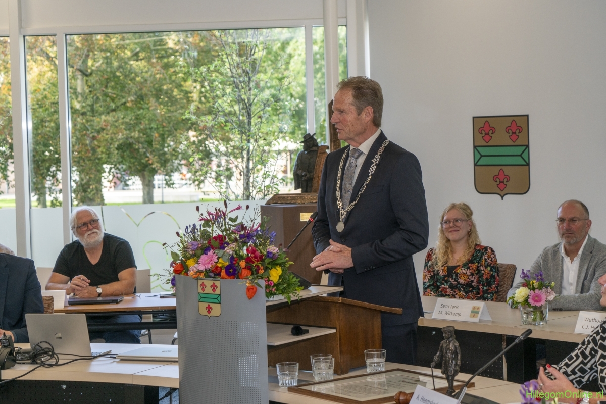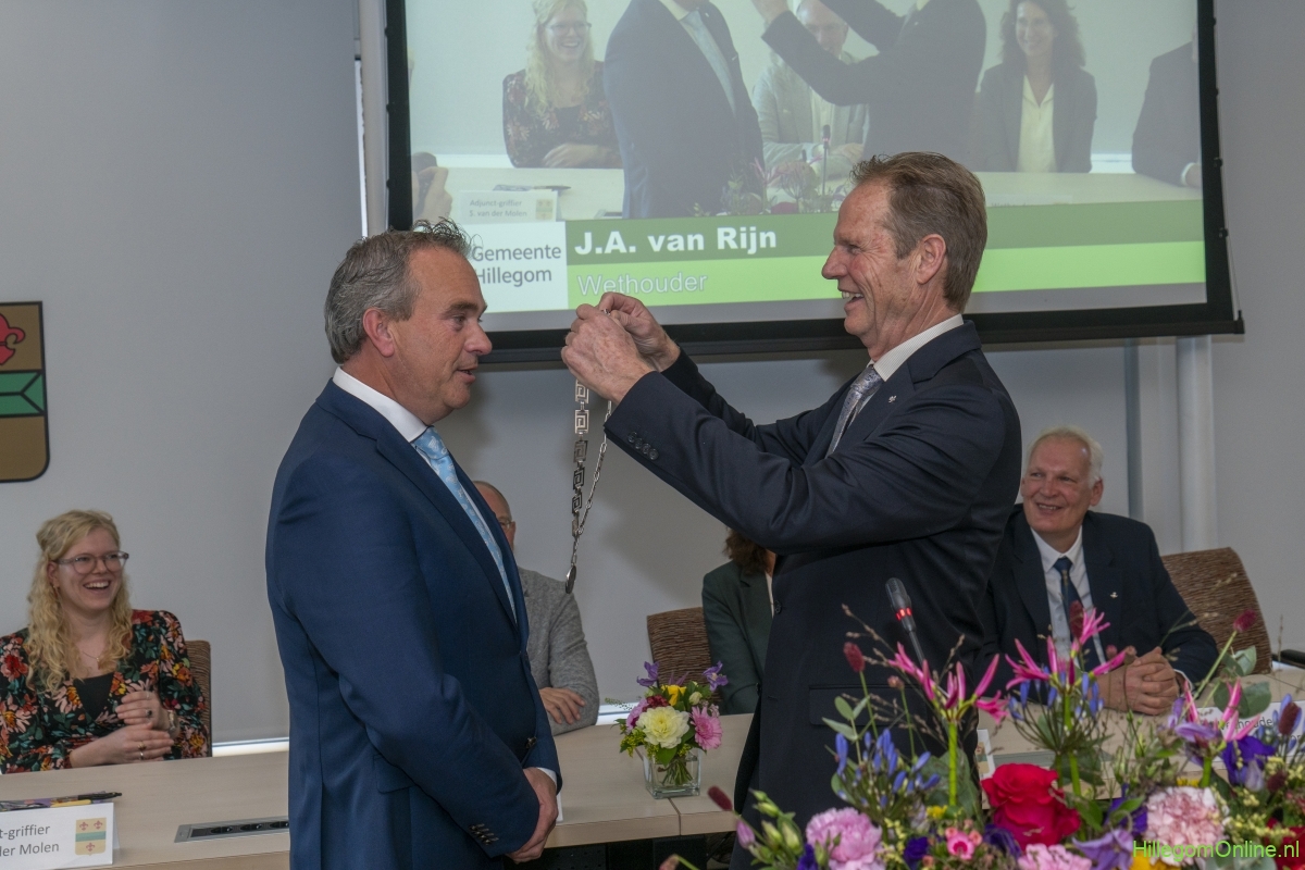In diverse speeches hoorden we over zijn enorme inzet en warme betrokkenheid. Wethouder Jan van Rijn overhandigde de burgemeester de Hillegomse Hangkous, als dank voor zijn jarenlange inzet. Nadat de burgemeester zelf nog had gesproken was het tijd de ambtsketting af te leggen. Jan van Rijn kreeg de ketting omgehangen, hij neemt de functie van burgemeester waar, totdat begin november de nieuwe burgemeester zal worden geïnstalleerd.