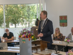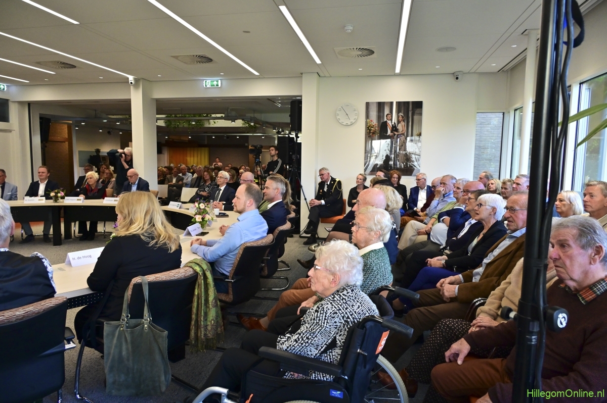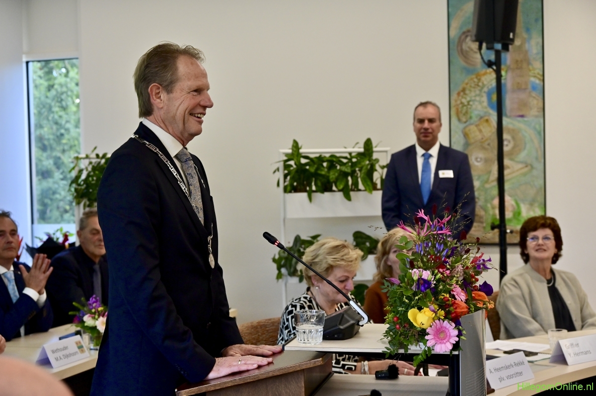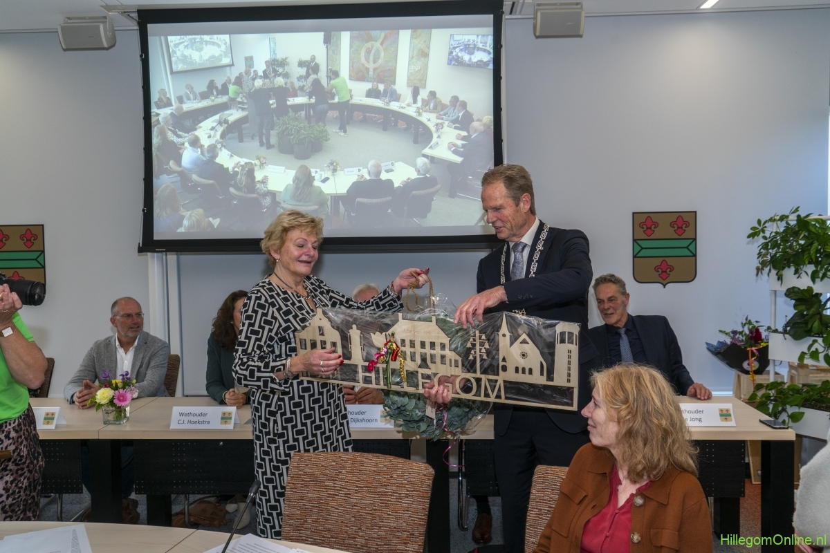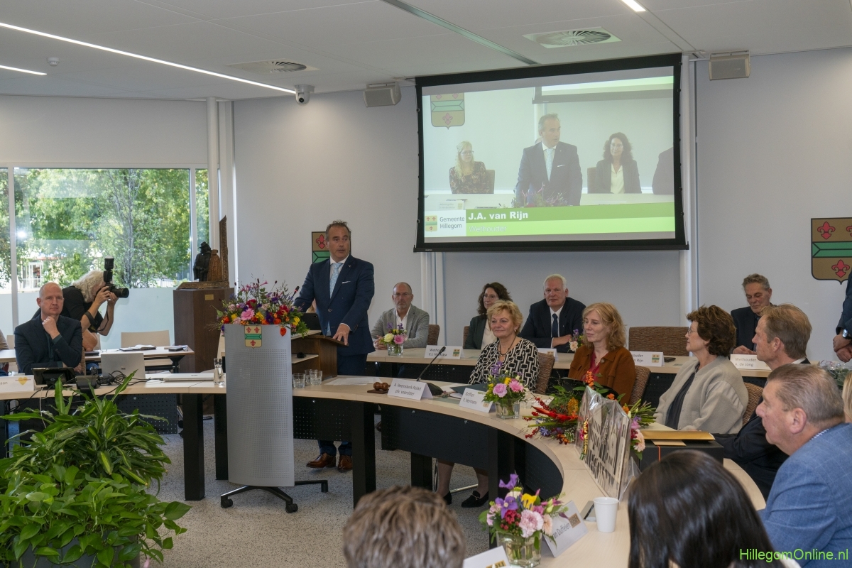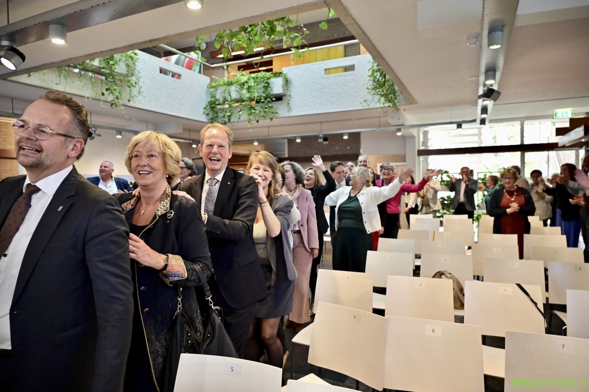 In diverse speeches hoorden we over zijn enorme inzet en warme betrokkenheid. Wethouder Jan van Rijn overhandigde de burgemeester de Hillegomse Hangkous, als dank voor zijn jarenlange inzet. Nadat de burgemeester zelf nog had gesproken was het tijd de ambtsketting af te leggen. Jan van Rijn kreeg de ketting omgehangen, hij neemt de functie van burgemeester waar, totdat begin november de nieuwe burgemeester zal worden geïnstalleerd.
