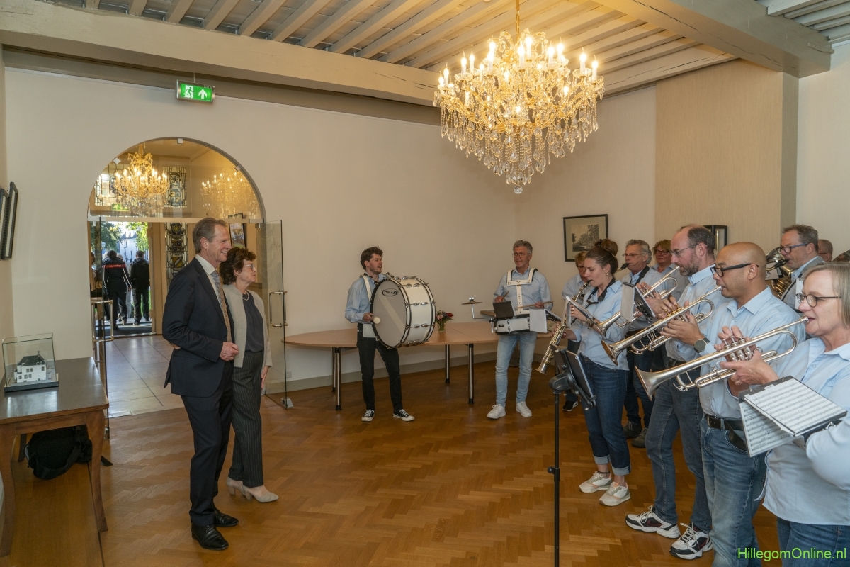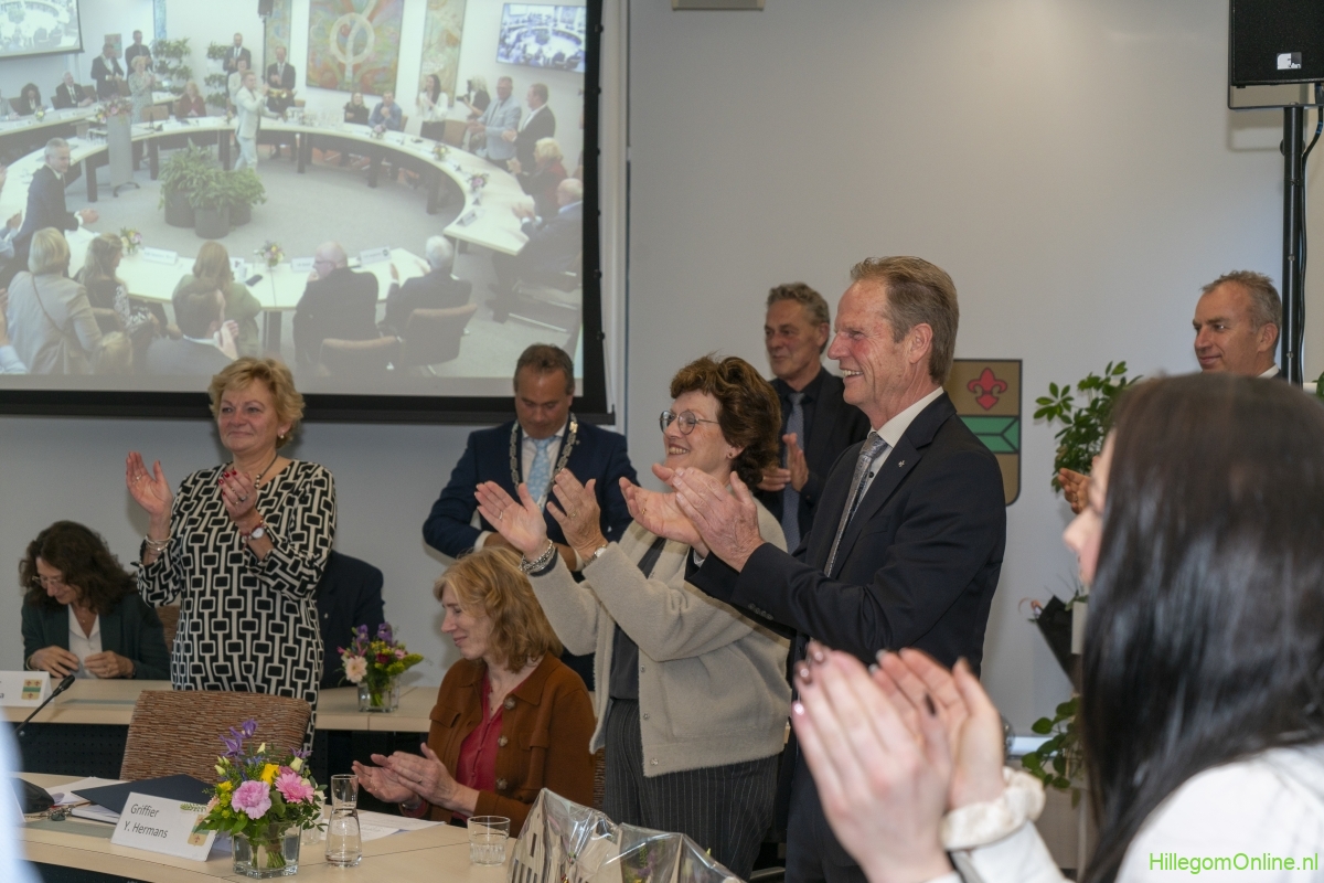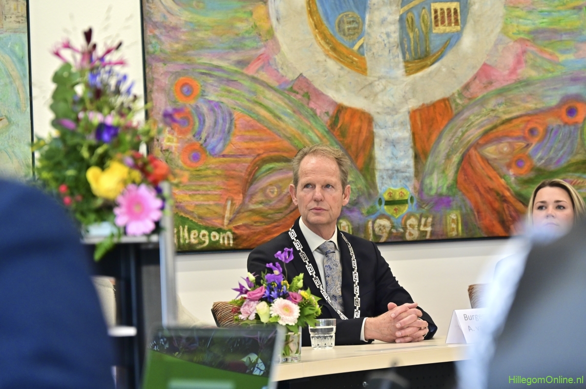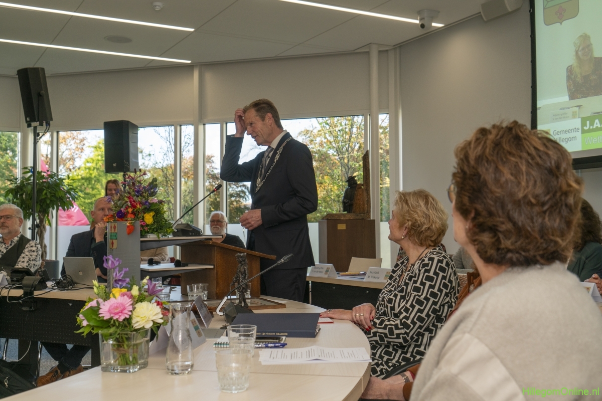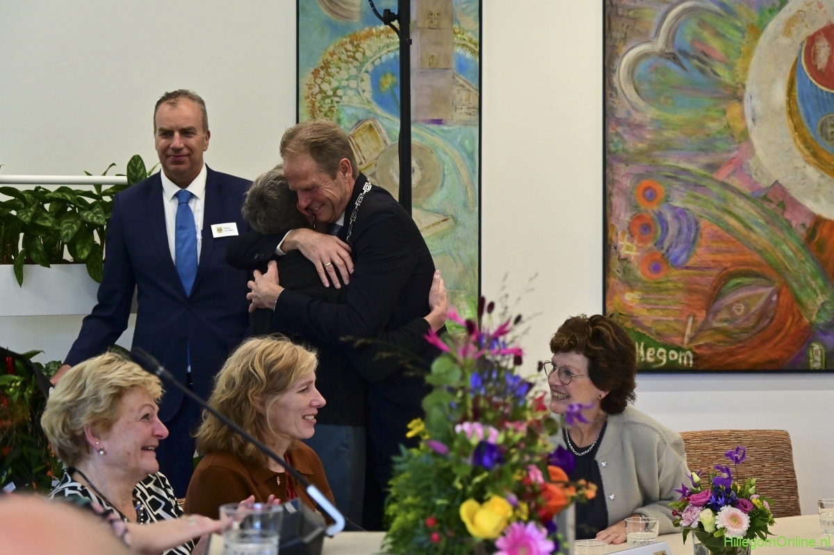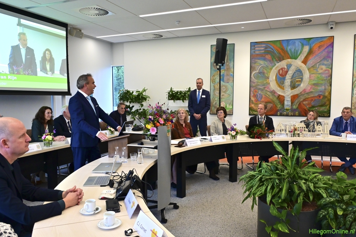 In diverse speeches hoorden we over zijn enorme inzet en warme betrokkenheid. Wethouder Jan van Rijn overhandigde de burgemeester de Hillegomse Hangkous, als dank voor zijn jarenlange inzet. Nadat de burgemeester zelf nog had gesproken was het tijd de ambtsketting af te leggen. Jan van Rijn kreeg de ketting omgehangen, hij neemt de functie van burgemeester waar, totdat begin november de nieuwe burgemeester zal worden geïnstalleerd.