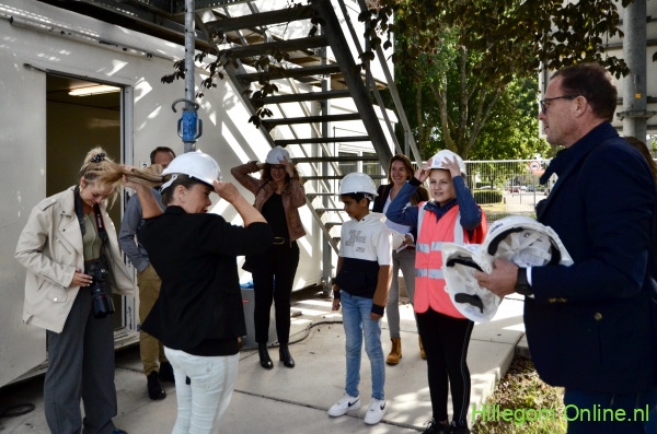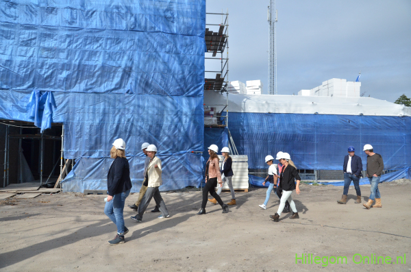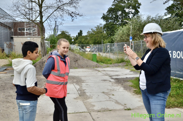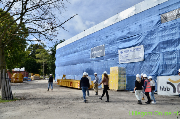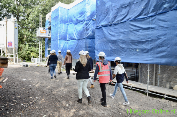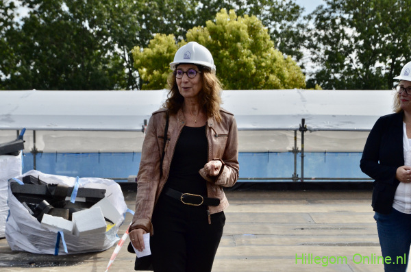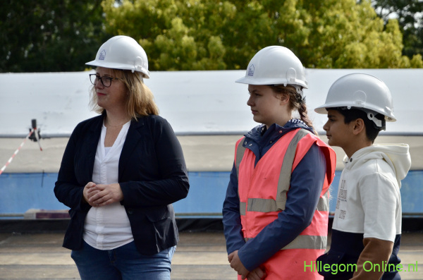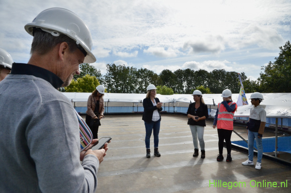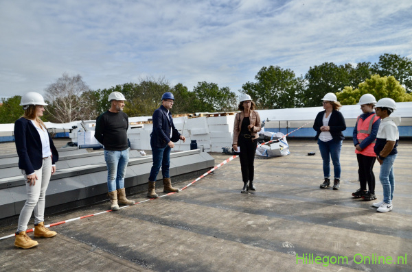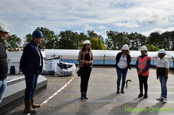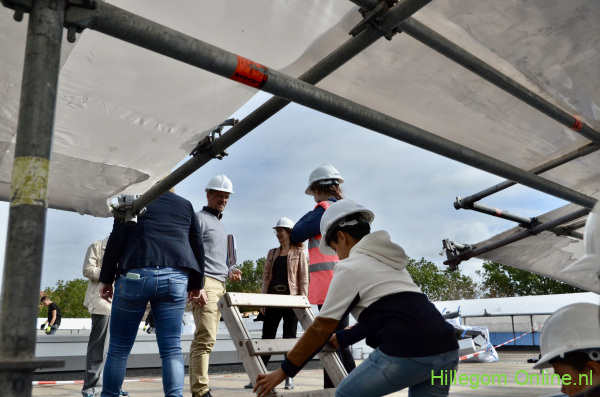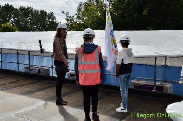Alle bouwvakkers verzamelden zich voor dit moment. Directeur Friedeke van der Lei heette iedereen welkom. Daarna memoreerde de wethouder dat bij het vorige ‘fotomoment’, slechts een half jaar geleden, alles nog vlak was. Ditmaal stonden we op het dak. Zij bedankte de bouwers hartelijk voor hun werk. De wethouder vertelde ook nog dat de bedoeling is het dak vol te leggen met zonnecellen, niet alleen voor de energievoorziening van de school maar ook voor een deel van Hillegom van energie te voorzien.