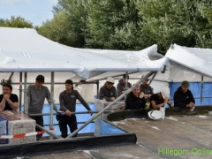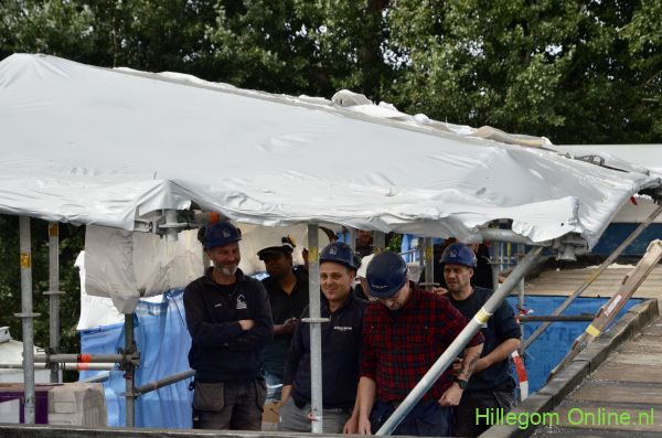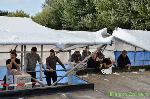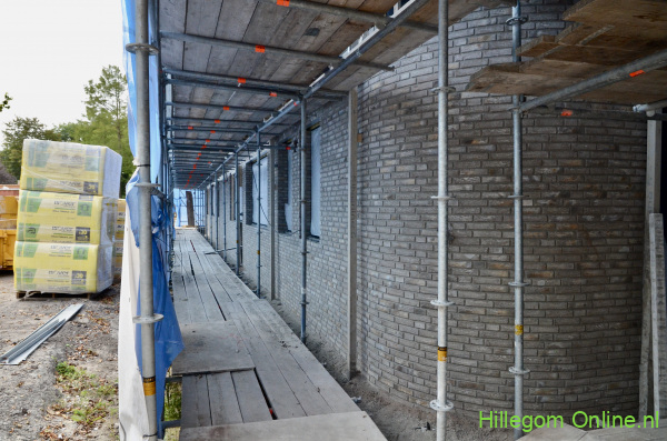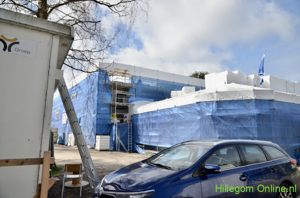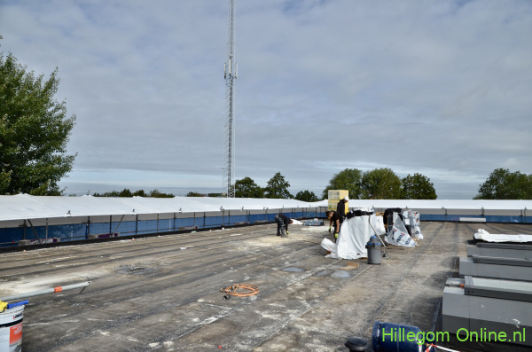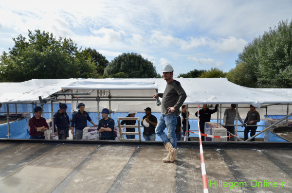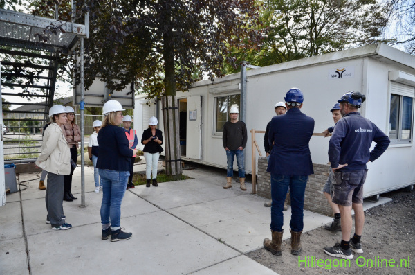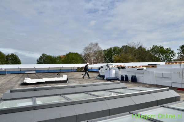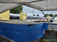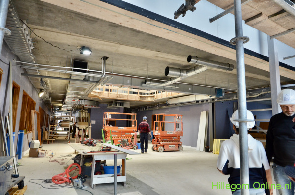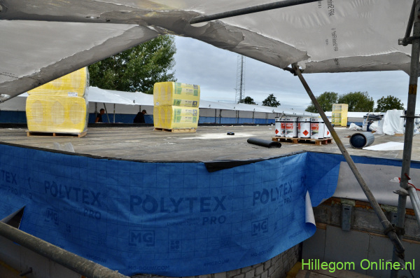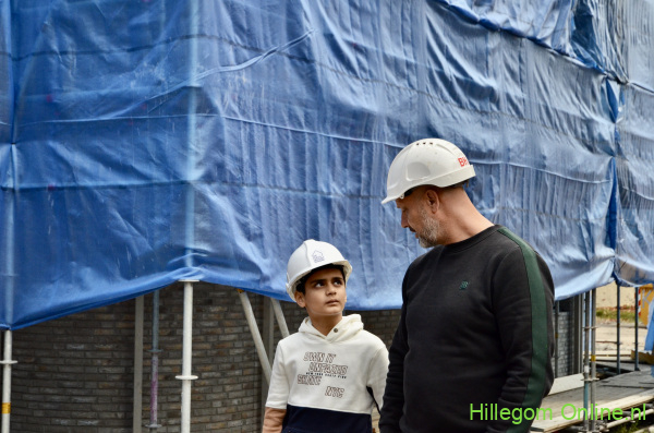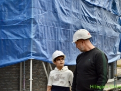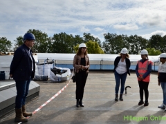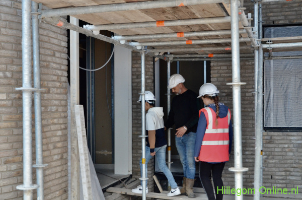 Alle bouwvakkers verzamelden zich voor dit moment. Directeur Friedeke van der Lei heette iedereen welkom. Daarna memoreerde de wethouder dat bij het vorige ‘fotomoment’, slechts een half jaar geleden, alles nog vlak was. Ditmaal stonden we op het dak. Zij bedankte de bouwers hartelijk voor hun werk. De wethouder vertelde ook nog dat de bedoeling is het dak vol te leggen met zonnecellen, niet alleen voor de energievoorziening van de school maar ook voor een deel van Hillegom van energie te voorzien.