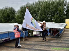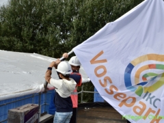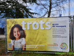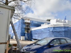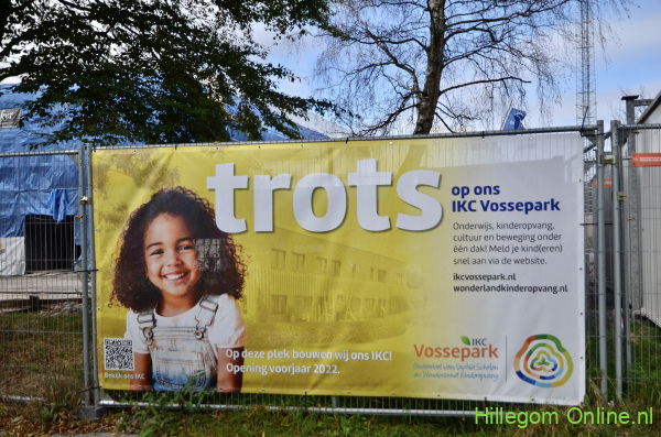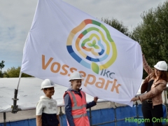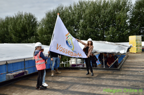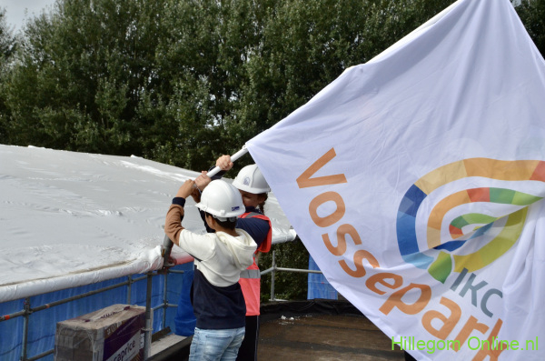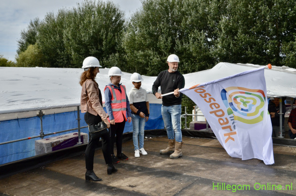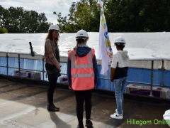 Hillegom – Vanmorgen werd door wethouder Karin Hoekstra en door twee leerlingen van basisschool Meer en dorp de nieuwe vlag geplaatst op het in aanbouw zijnde gebouw. Dit vanwege het bereiken van het hoogste punt van het IKC Vossepark.