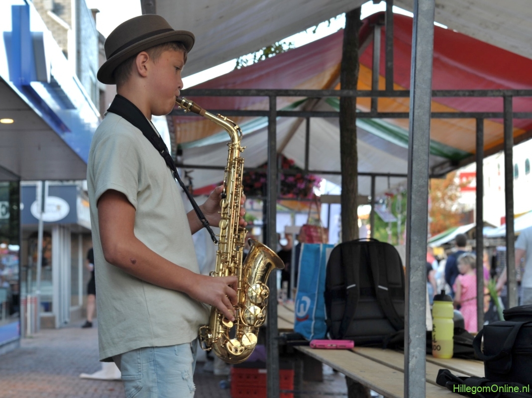 Hillegom – Donderdag 28 augustus stond in de Hoofdstraat weer de gezellige jaarmarkt. Ondanks de hevige regenbui aan het begin van de middag, werd de jaarmarkt druk bezocht . Aan einde van de avond was er een speciaal optreden van Hillegoms nieuwste saxofoonspeler, die de voorbijgangers heeft verwend met een paar bekende nummers.
