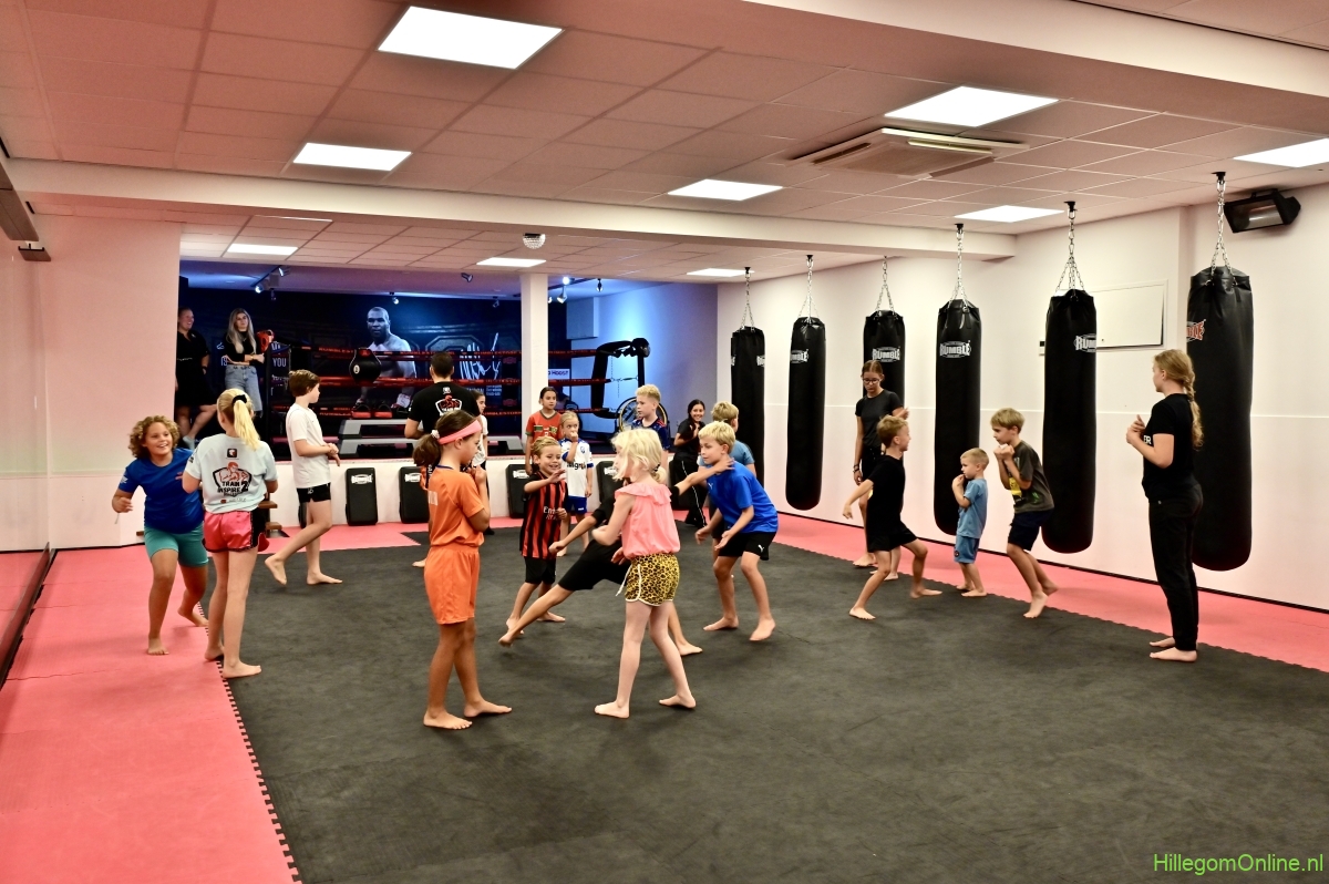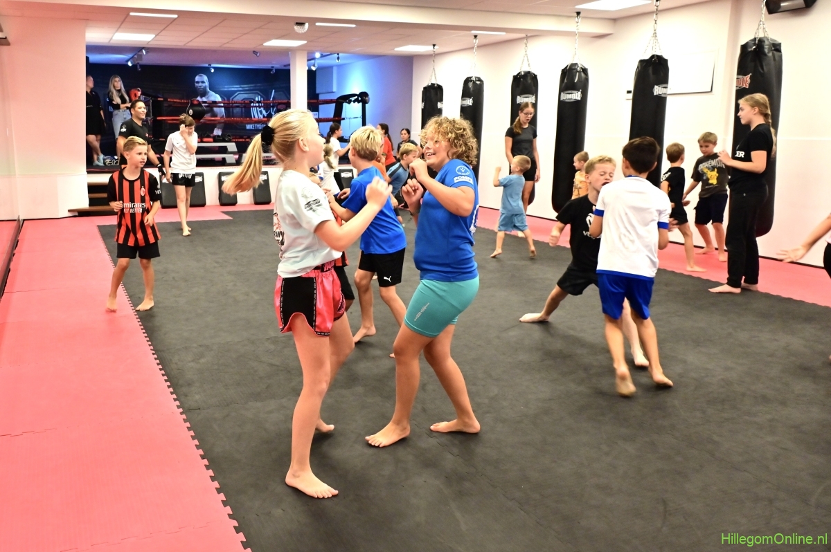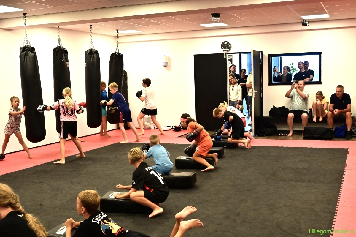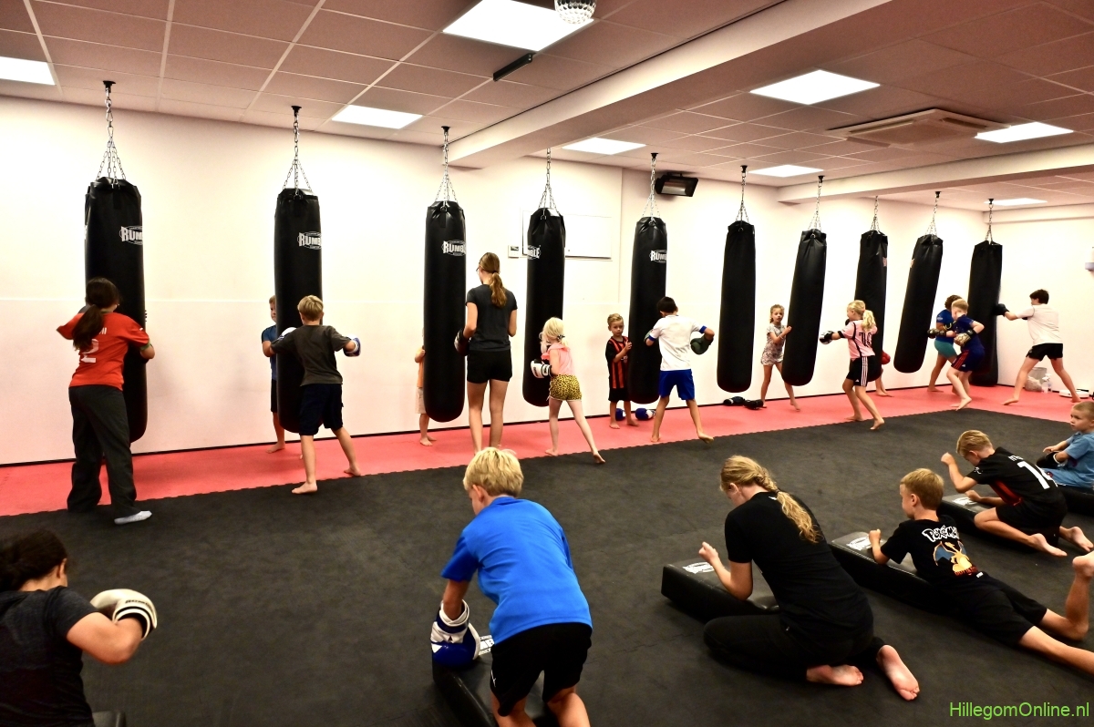 Dat verschil in leeftijd niet uitmaakt, bewees de kickboks clinic. Iedereen was enthousiast bezig.