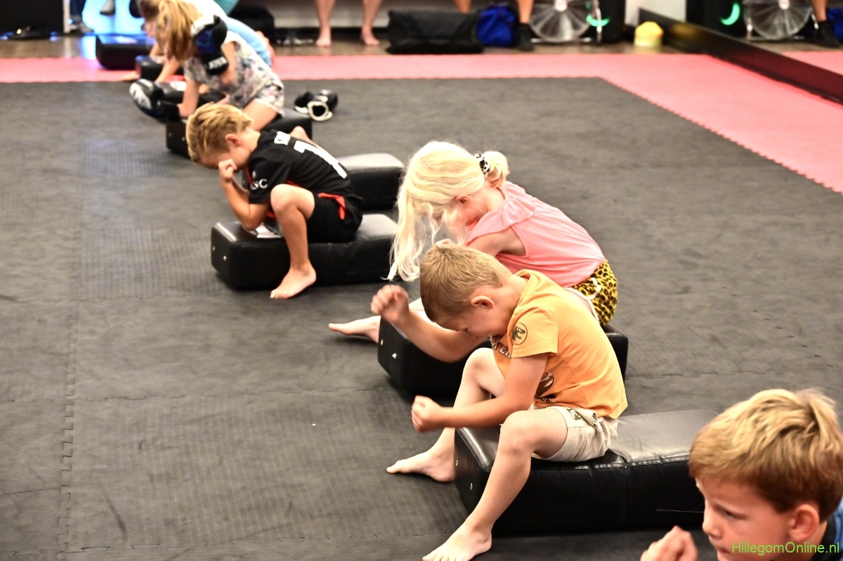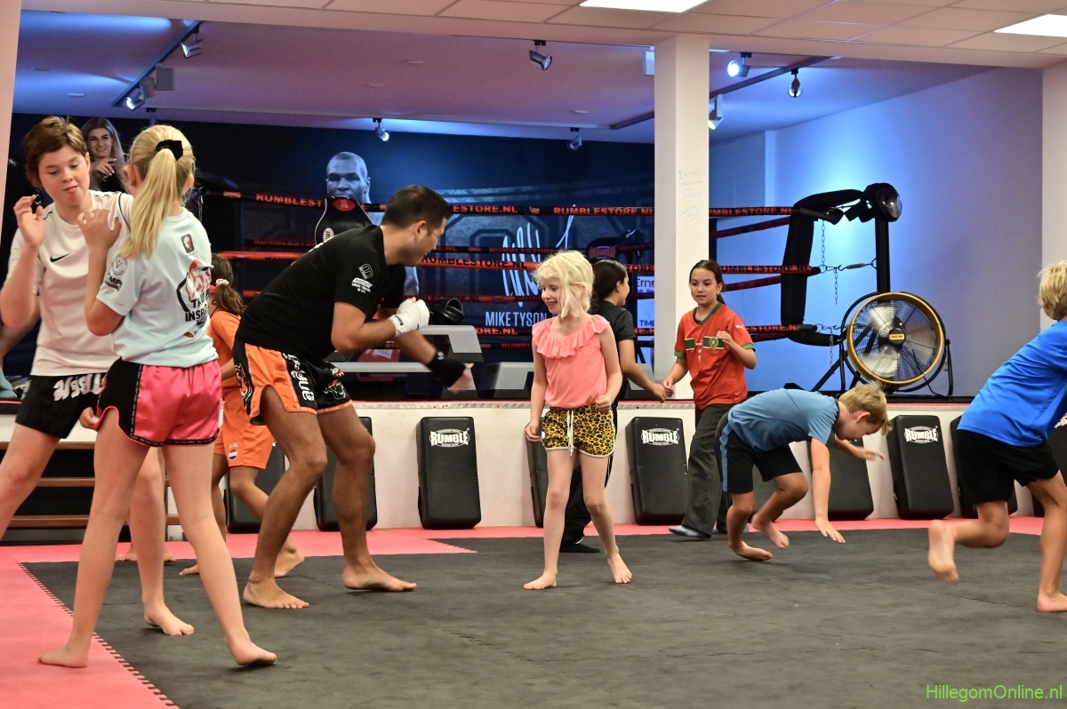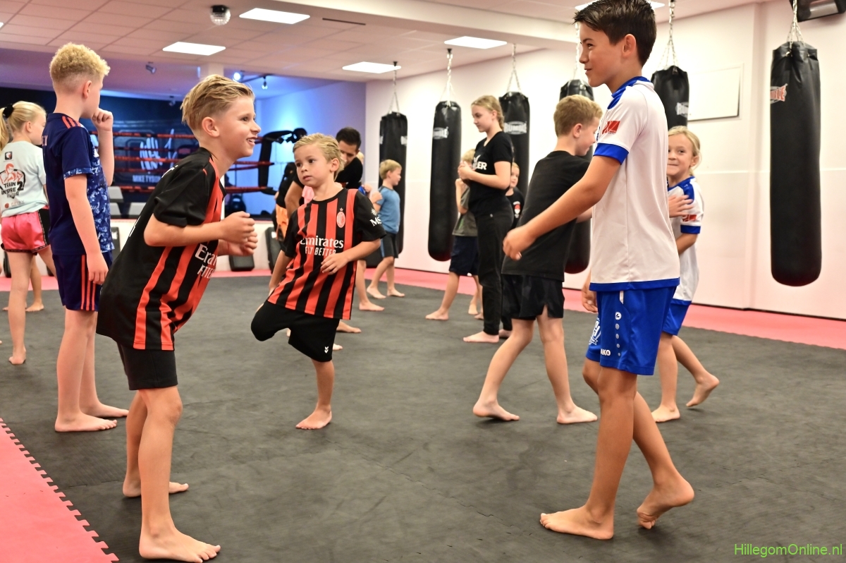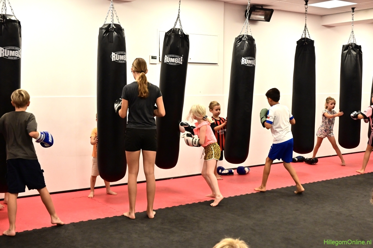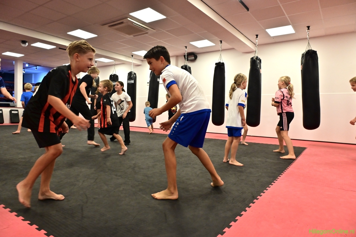 Dat verschil in leeftijd niet uitmaakt, bewees de kickboks clinic. Iedereen was enthousiast bezig.