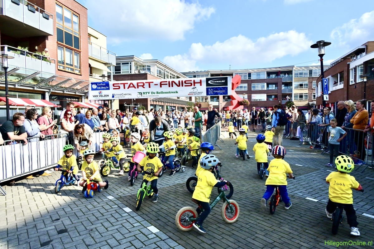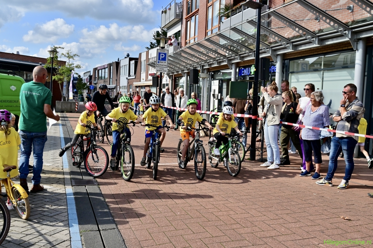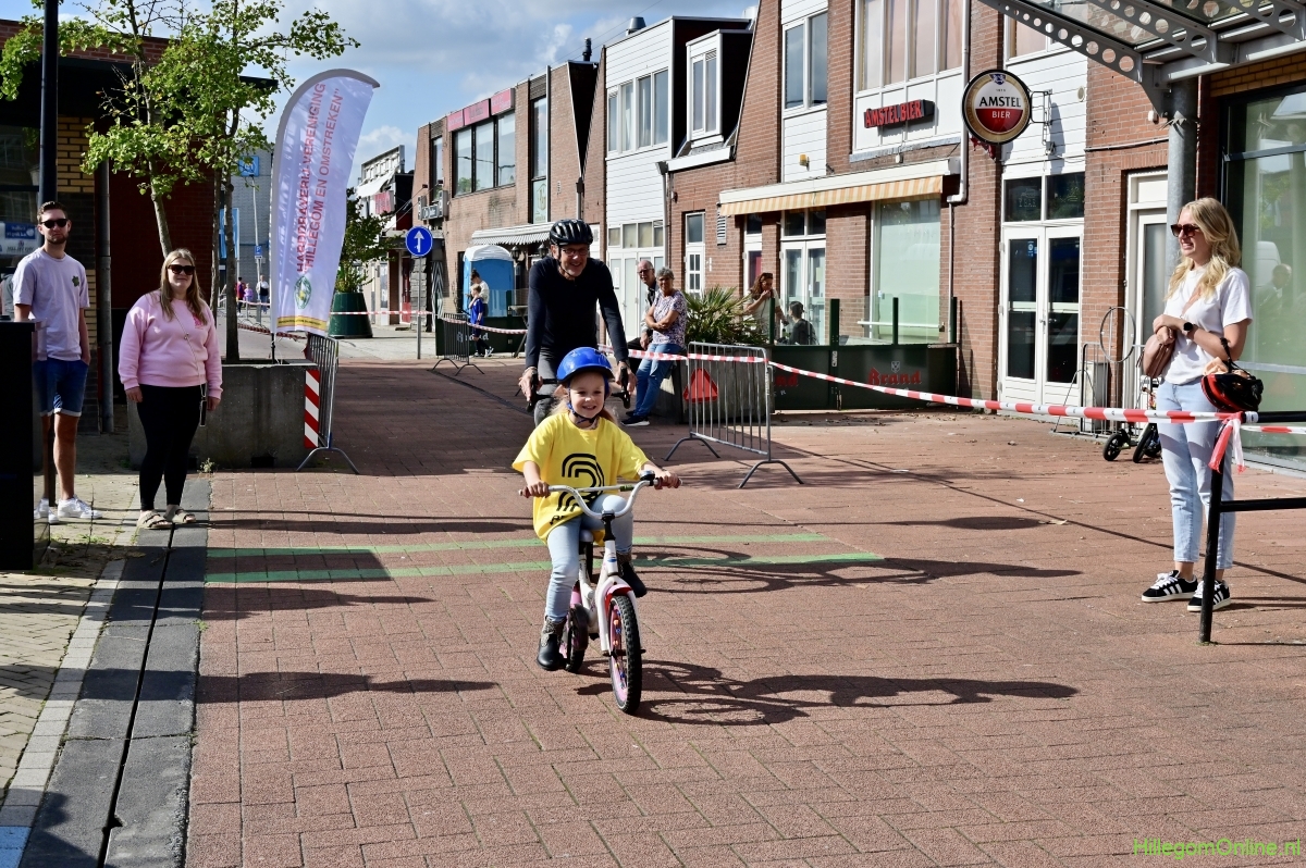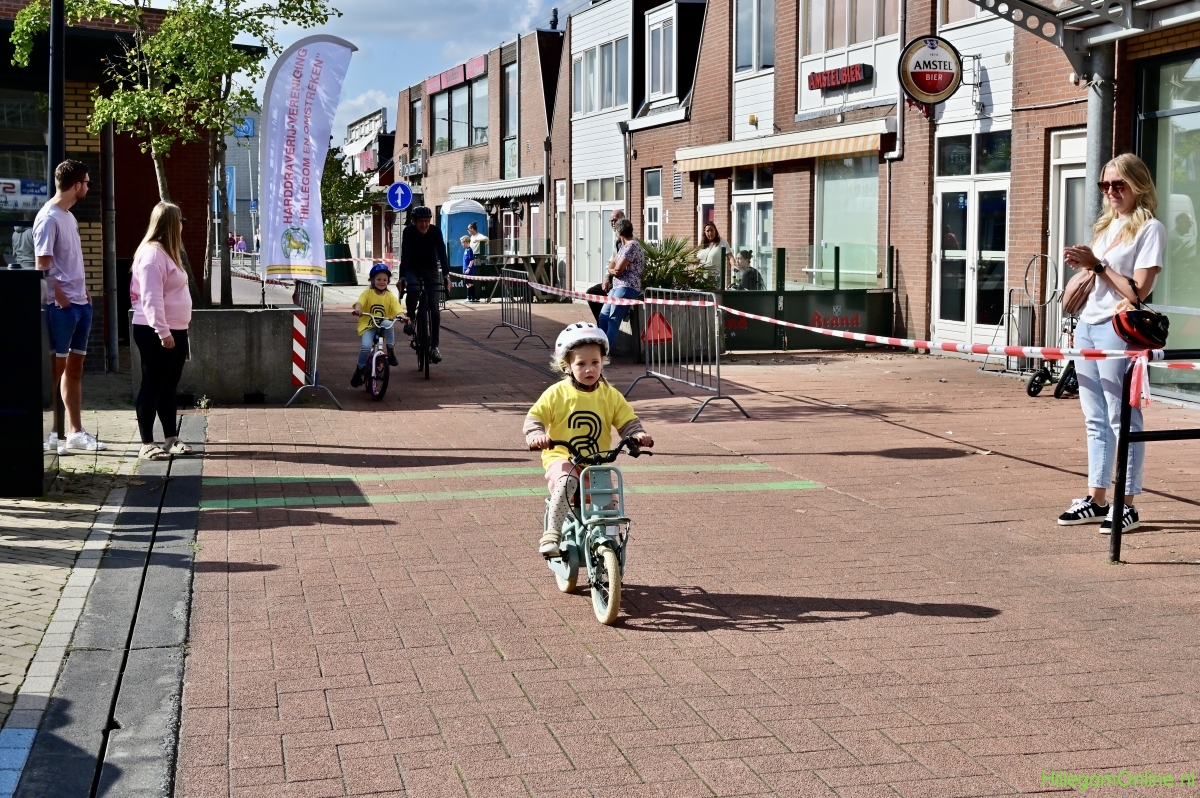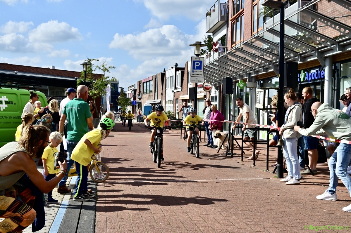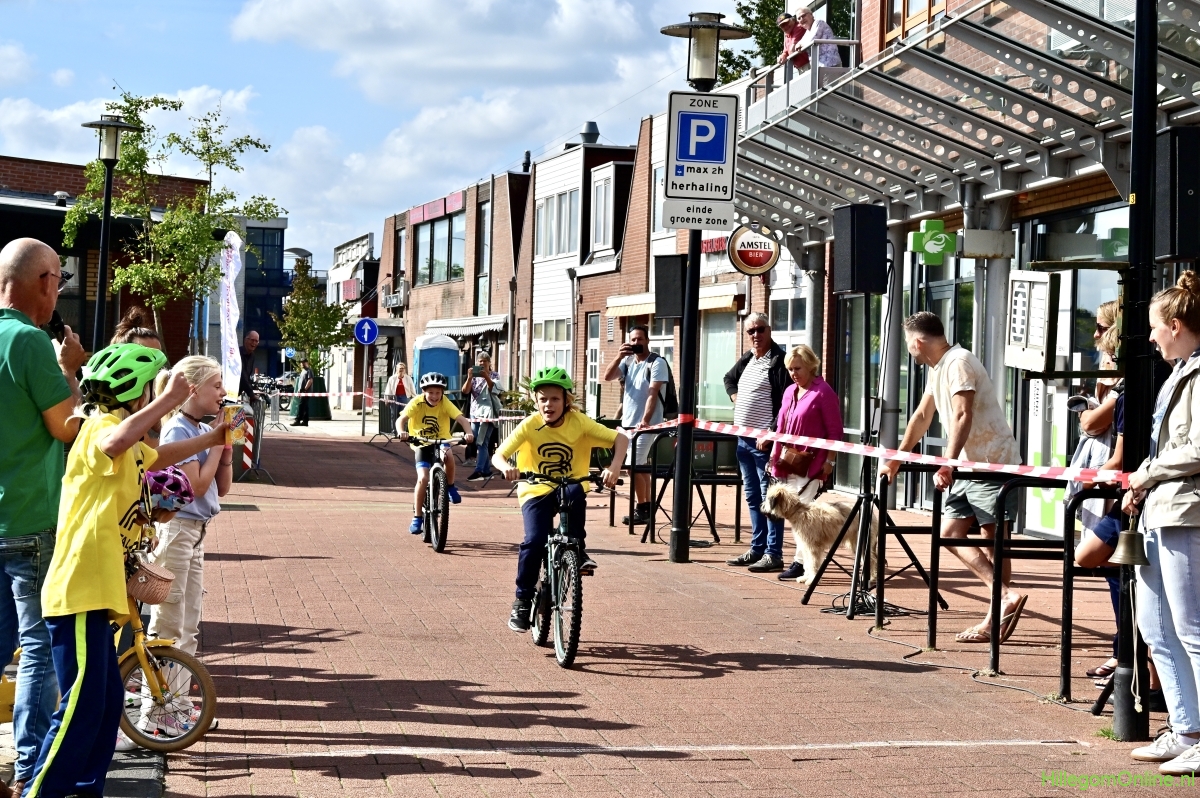 Hillegom – Op het Henry Dunantplein waren verschillende wielerrondes uitgezet. In het midden die voor de hummeltjes op hun loopfietsen. En een grotere ronde voor de dikke bandenrace die in verschillende categorieën gereden werd. Elke leeftijdscategorie kreeg er een rondje bij.