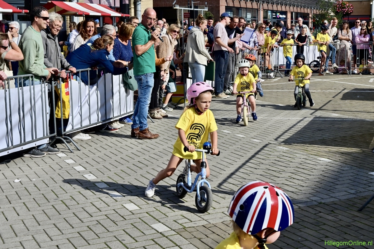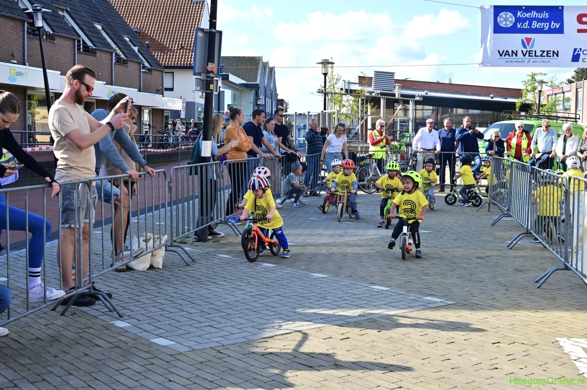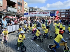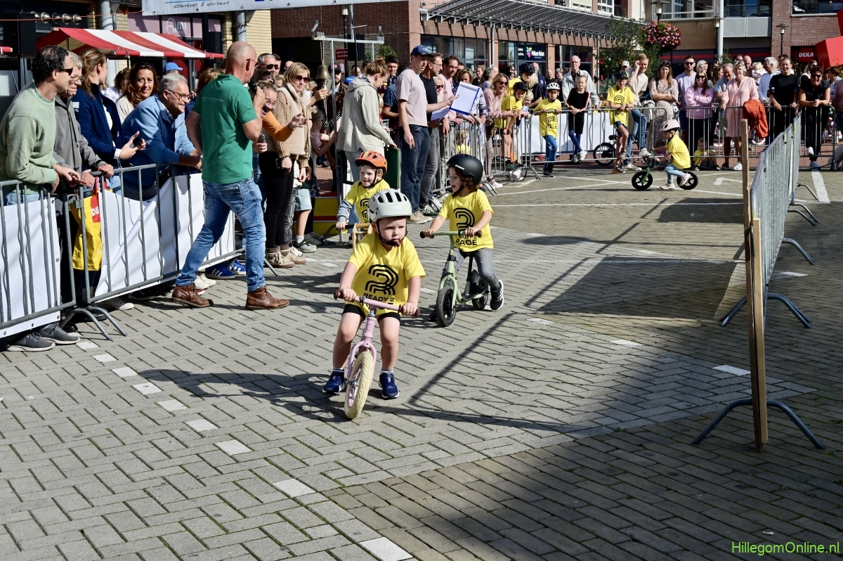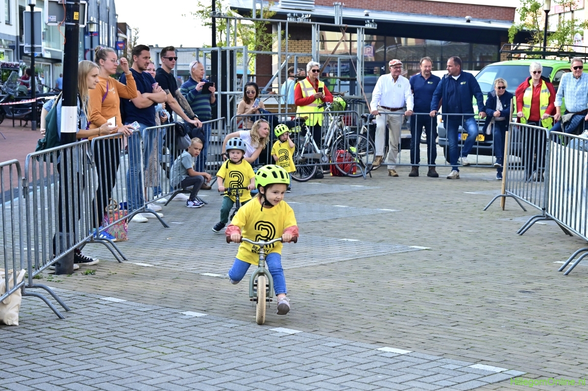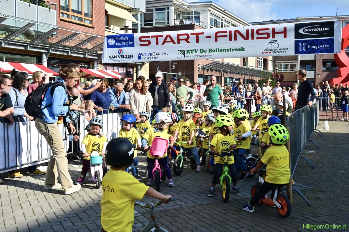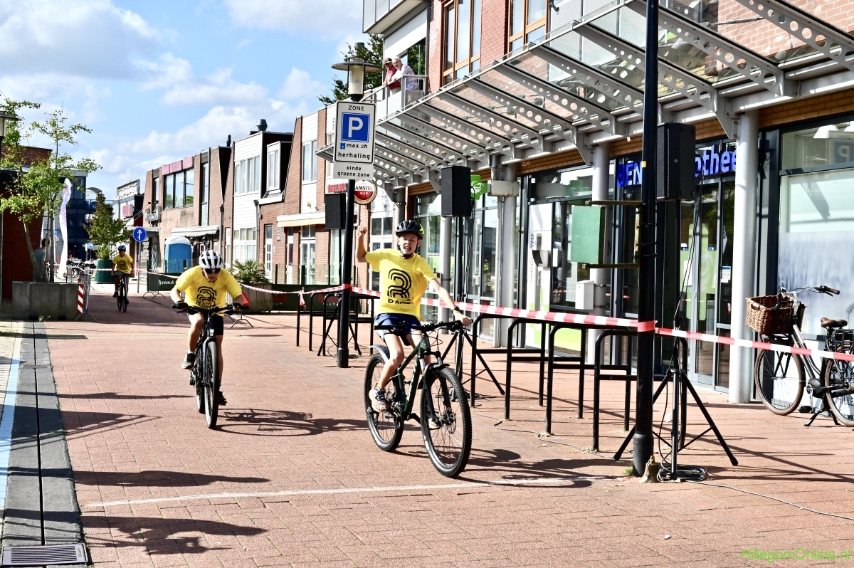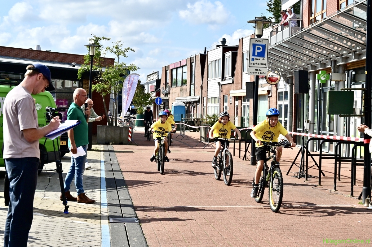 Hillegom – Op het Henry Dunantplein waren verschillende wielerrondes uitgezet. In het midden die voor de hummeltjes op hun loopfietsen. En een grotere ronde voor de dikke bandenrace die in verschillende categorieën gereden werd. Elke leeftijdscategorie kreeg er een rondje bij.
