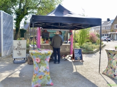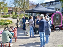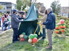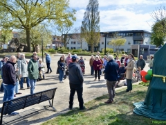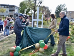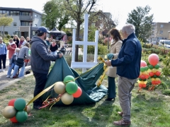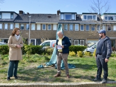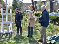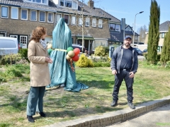 Hillegom – Woensdagmiddag 9 april is in het Julianapark een kunstwerk van kunstenaar David Moinot onthuld. Deze eer kwam toe aan wethouder Karin Hoekstra, initiatiefnemer Gerard Brom en de kunstenaar zelf. Het is een schildersezel van ruim 2 meter hoog, gemaakt van gewapend beton. Er staan in het Beltpark, Elsbroekerpark en het Van Nispenpark ook van deze grote schildersezels. David Moinot maakt meer straatmeubilair als kunstwerk en de bedoeling van deze ezels is dat ze voorbijgangers stimuleren om de omgeving met een andere blik te bekijken en wellicht te gaan tekenen of schilderen. Het is de droom van de kunstenaar om deze ezels ook in andere dorpen en steden te plaatsen, wat hem al op verschillende plekken gelukt is.