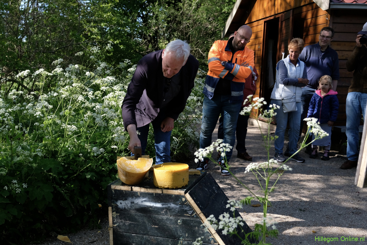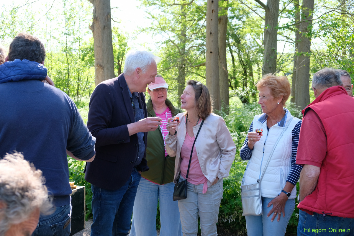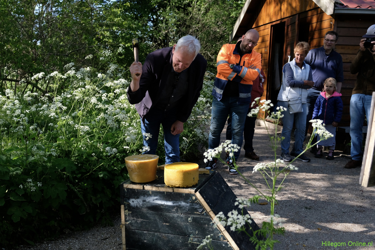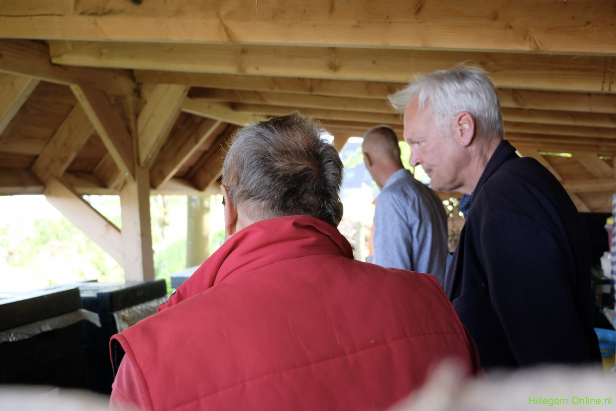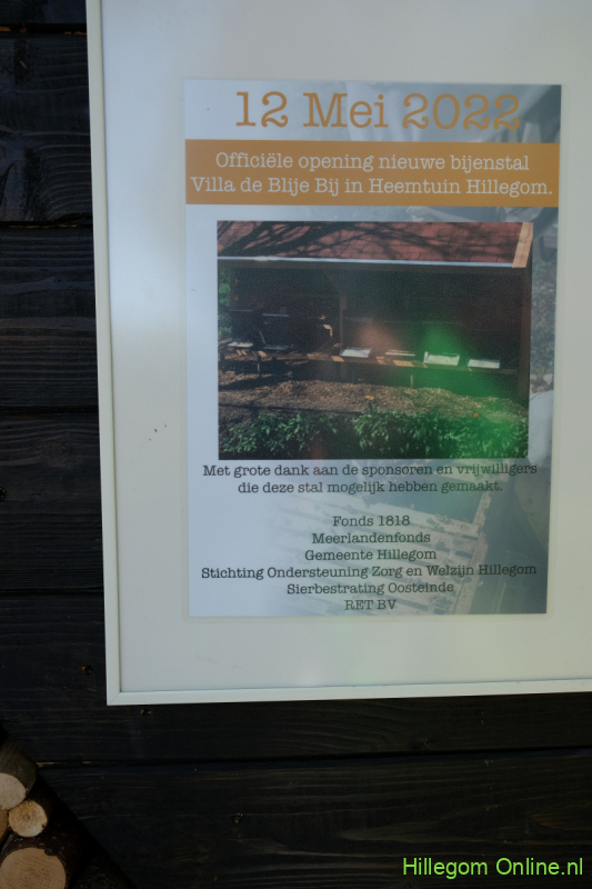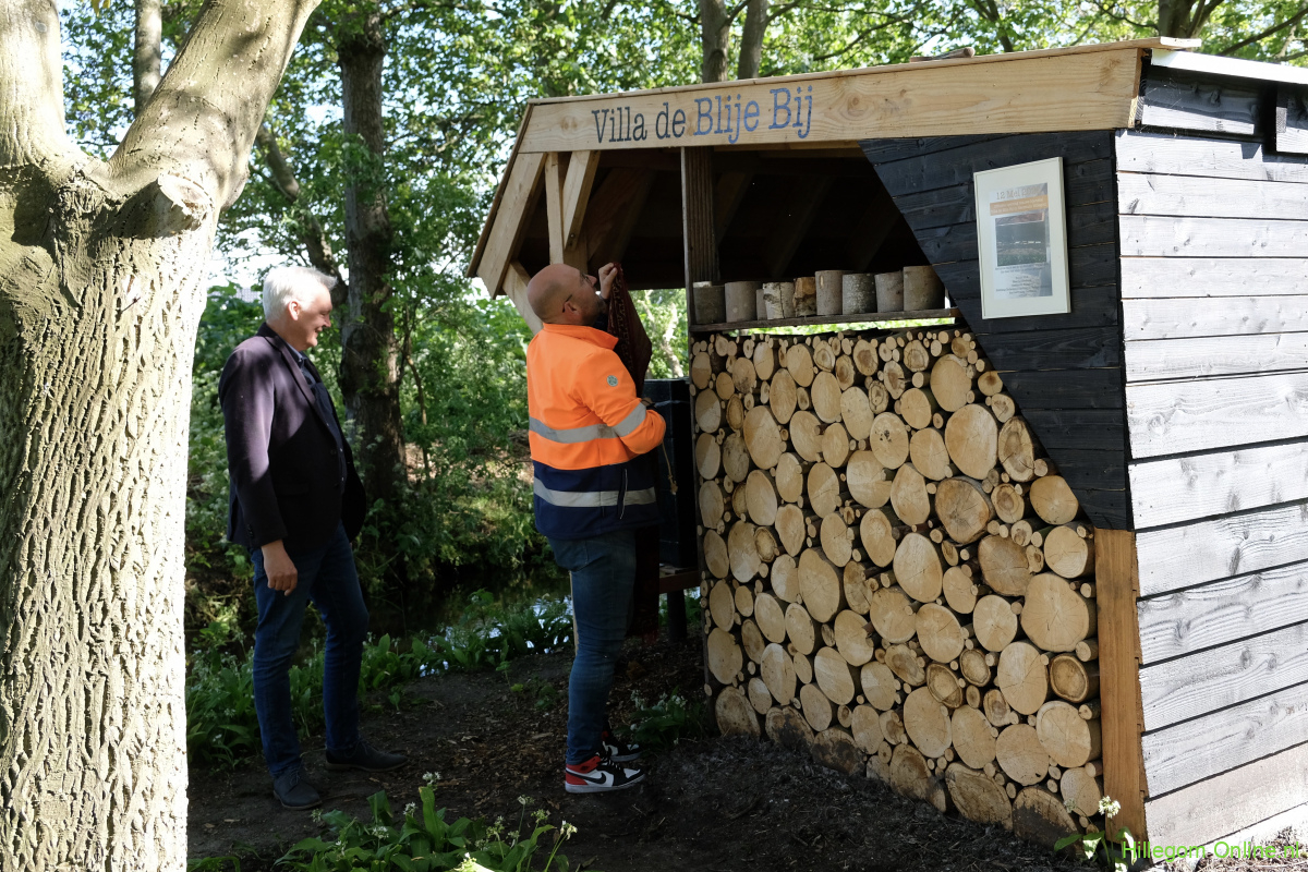 Hillegom – Op donderdag 12 mei was de officiële opening van de nieuwe bijenstal Villa de Blije Bij in de Heemtuin van Hillegom door wethouder Maarten Dijkshoorn en Dave Spithoven van Meerlanden. De bouw is tot stand gekomen door de vrijwilligers en de imkers Joop van der Aar en Peter Verbruggen en door sponsoring van: Meerlandenfonds, fonds 1818, gemeente Hillegom, SOZW Hillegom, sierbestrating Oosteinde en RET bv. De opening vond plaats door het in stukken hakken van blokken bijenwas en het onthullen van het naambord. Na afloop konden de aanwezigen genieten van Ambrosius een honingwijn. De lokaal geproduceerde honing wordt ter plaatse verkocht door de imkers en de opbrengsten komen ten goede aan de bijenstal.